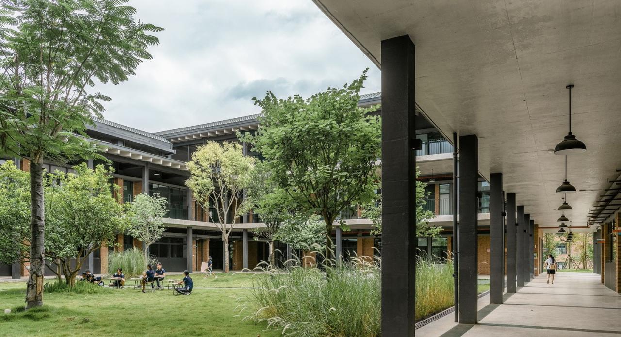 模糊空间边界:走廊围合院落的每一座单体建筑都像一棵巨树,与庭院里高高低低的植物树木交相应和。出檐深远的屋顶,给教室带来了更多的荫凉,也撑起了宽大开敞的走廊,能够在阴雨或暴晒的天气里为孩子们提供活动场地。