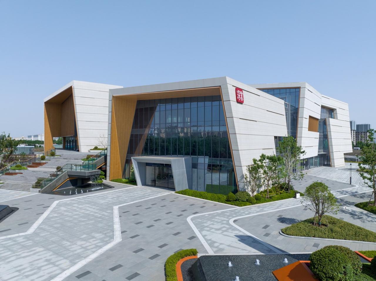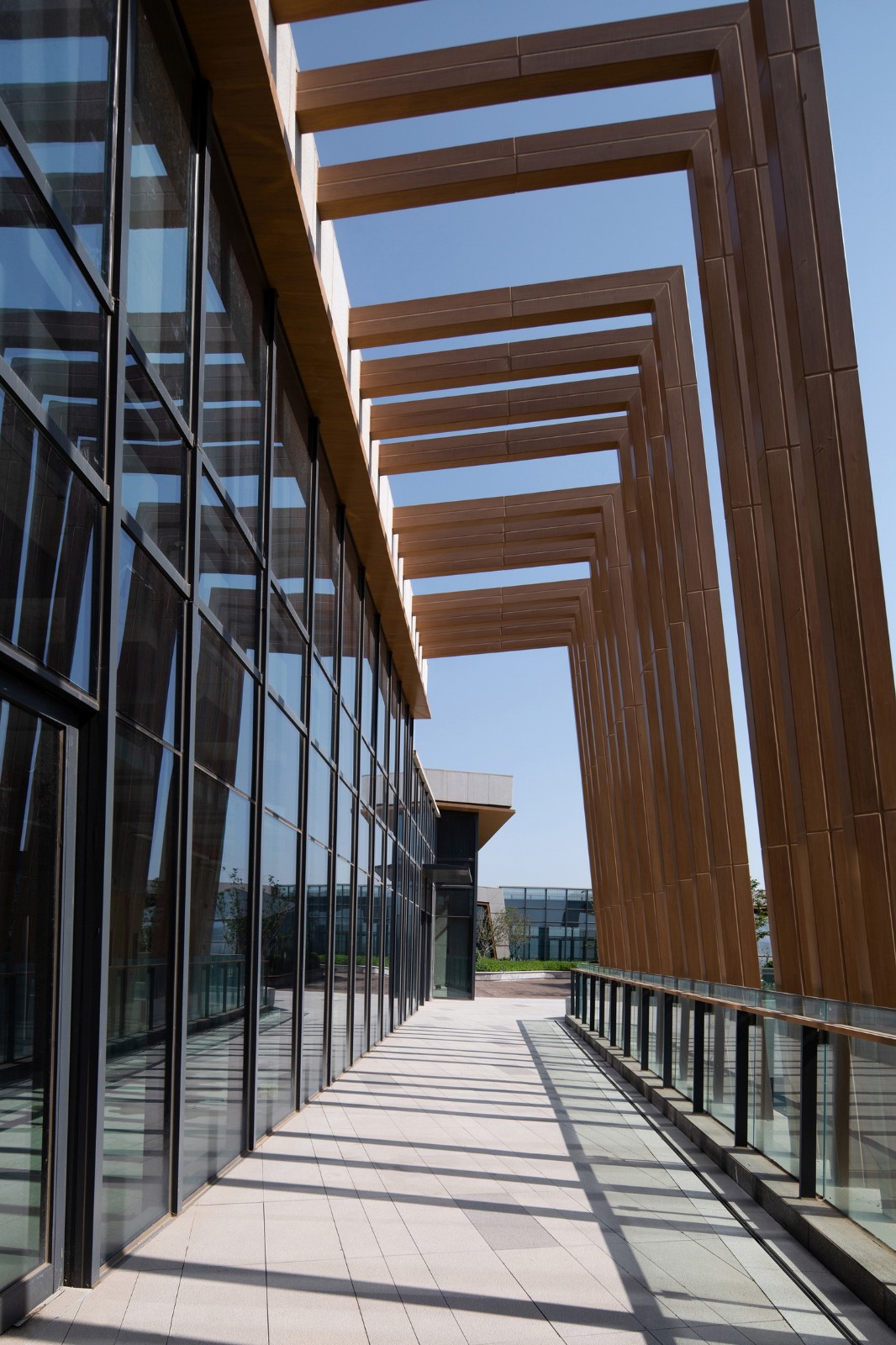 建筑立面利用石材的肌理来体现山的意向,配合大量玻璃面,虚实结合,丰富建筑立面节奏变化。整体结合山形意向,建筑形态与空间层次丰富,宛如在山谷中漫步,富有较强的空间趣味。