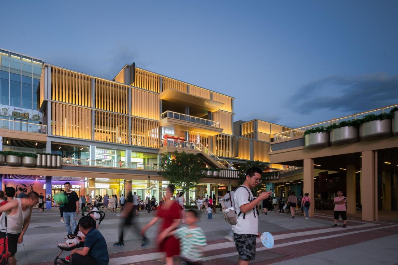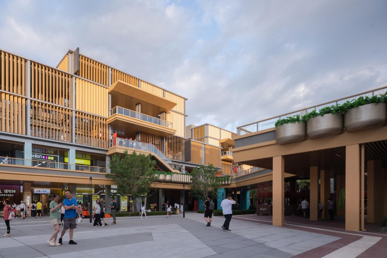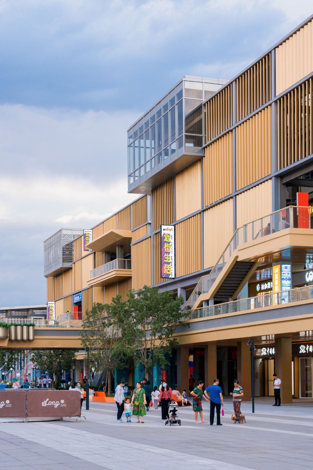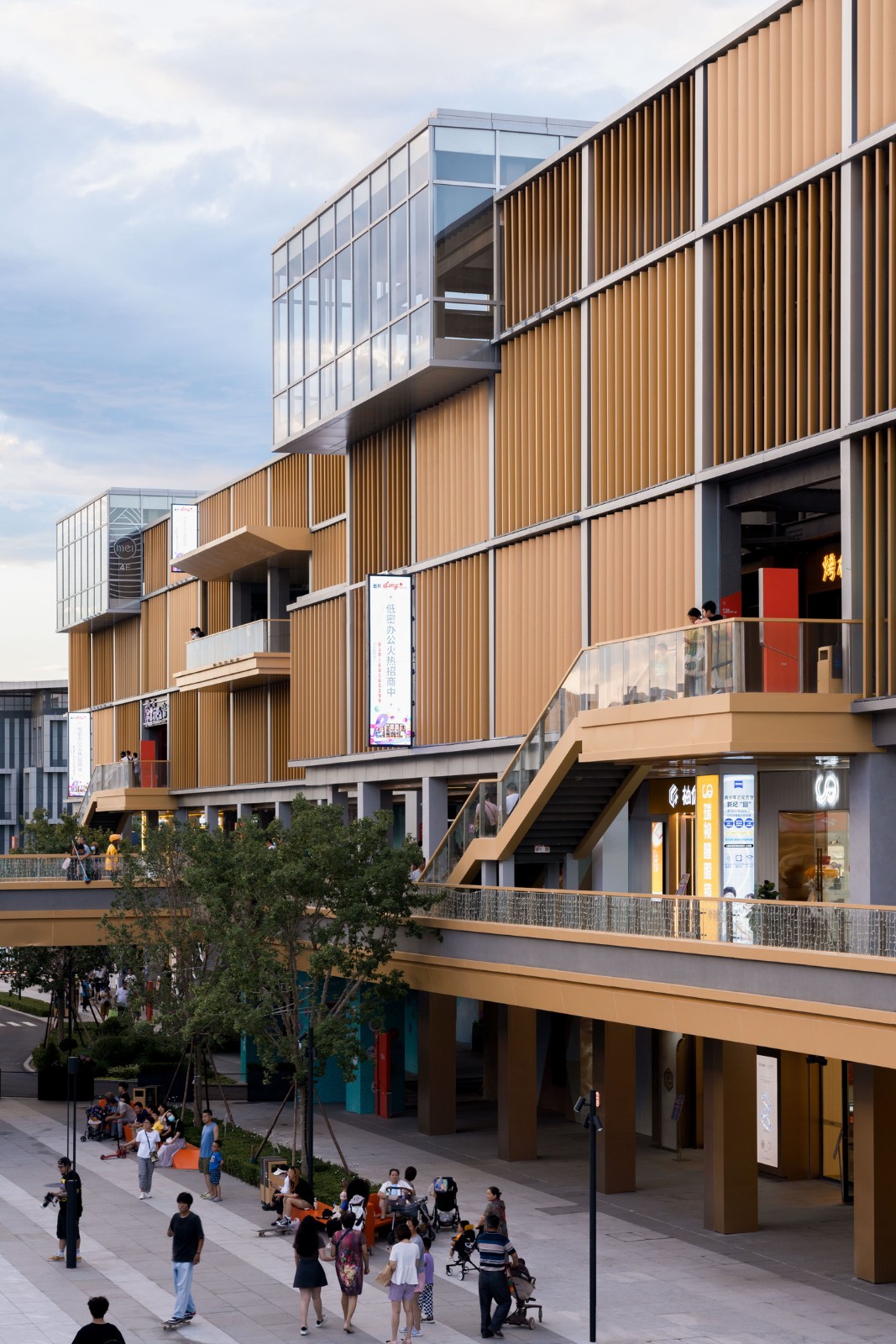 传统造型的木色阳台为商业提供了额外的外摆空间,它们凸出在“格栅”之外,与扶梯一起成为立体交通的建筑符号,顾客可以根据这些特别的提示,规划自己的购物流线。