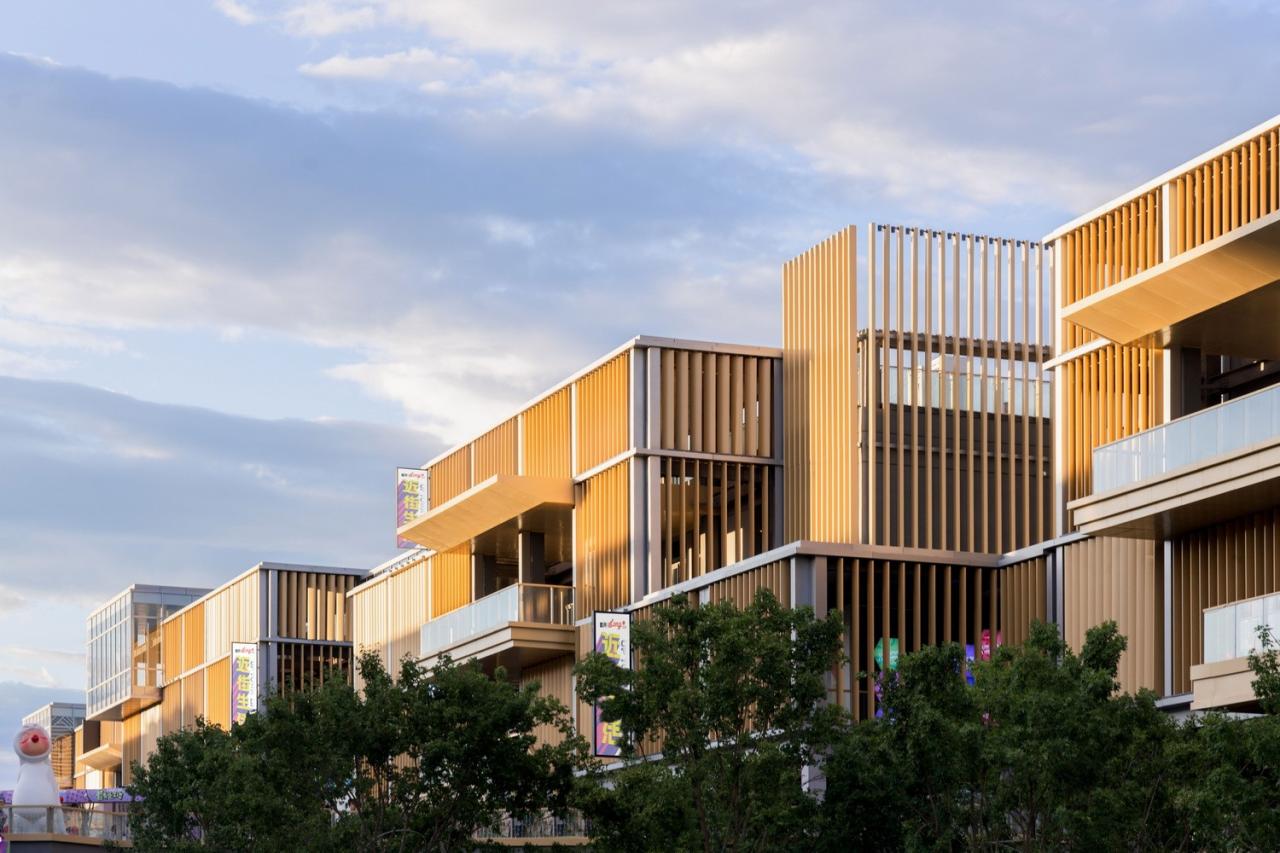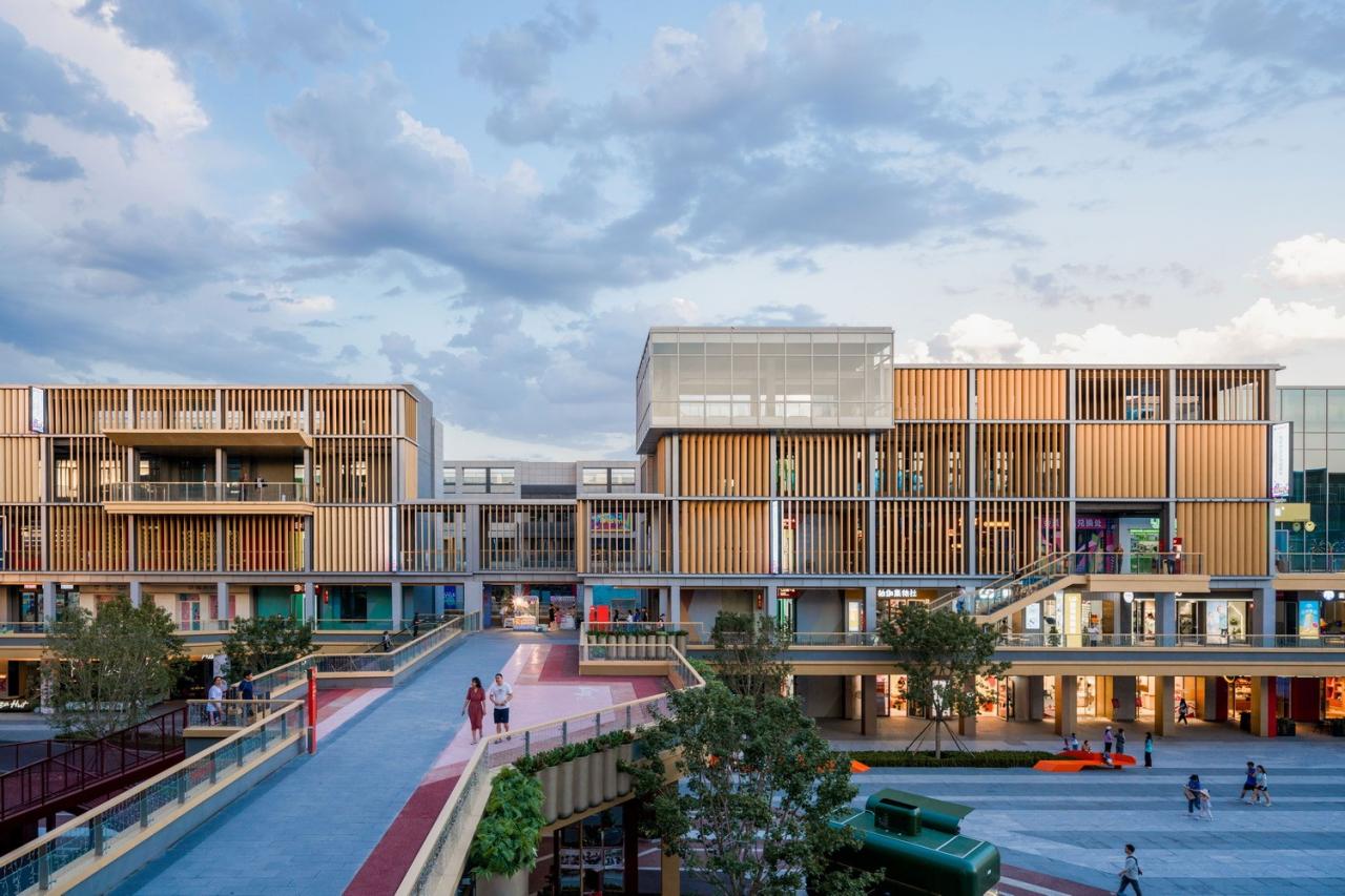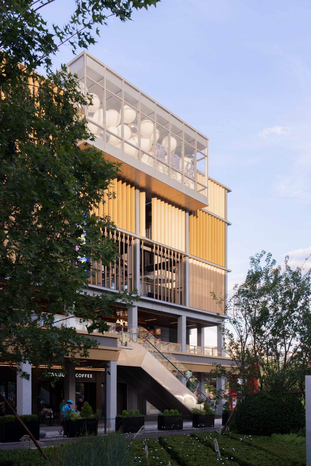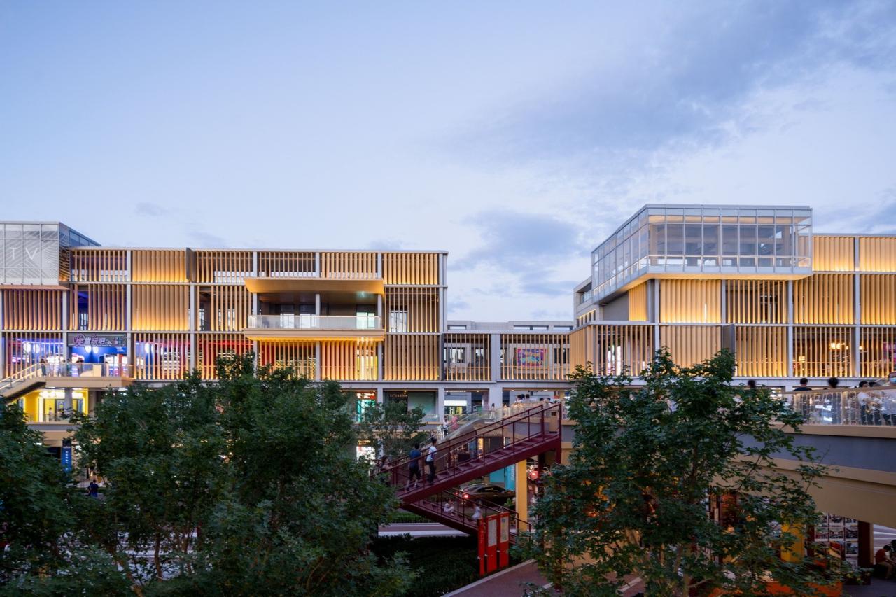 传统造型的木色阳台为商业提供了额外的外摆空间,它们凸出在“格栅”之外,与扶梯一起成为立体交通的建筑符号,顾客可以根据这些特别的提示,规划自己的购物流线。