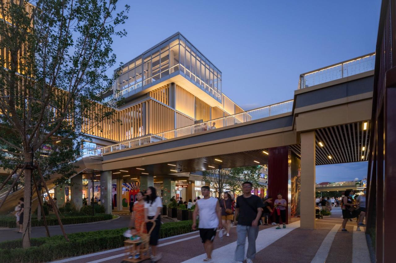 霍营西路把项目生硬地划分为两个街区,两侧建筑相距50米,形成了巨大挑战。如何把两个街区连接在一起?人行天街的引入则势在必行。新建的两座天桥在空中创造了新的开放空间,提供了感知建筑的不同视角,游客可以在桥上行走,也可以趴在栏杆上看风景,于此同时,他们也成为别人眼睛里的风景。就好像清明上河图一样,创造了一个有故事,有层次的商业画卷。