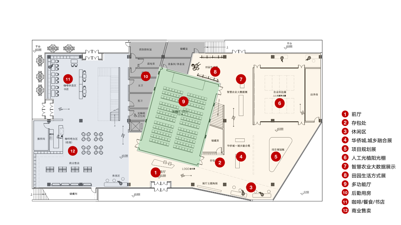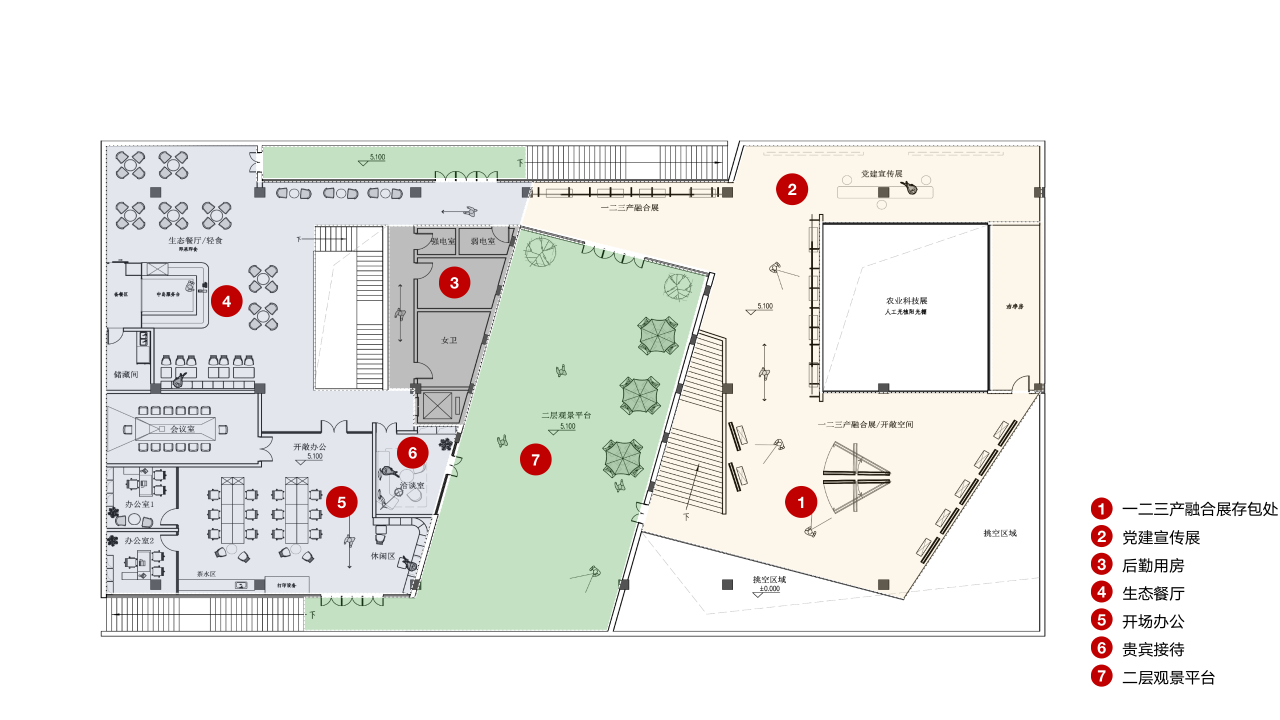 展览展示空间、有温度的服务空间两种功能相互融合,满足展示中心作为举办各类文化艺术展、商业性展览及艺术活动的交流场所的需要,回应两种功能并存的诉求——既是乡村振兴成果展示的重要场所,也是田园文化与时尚生活的展现舞台。