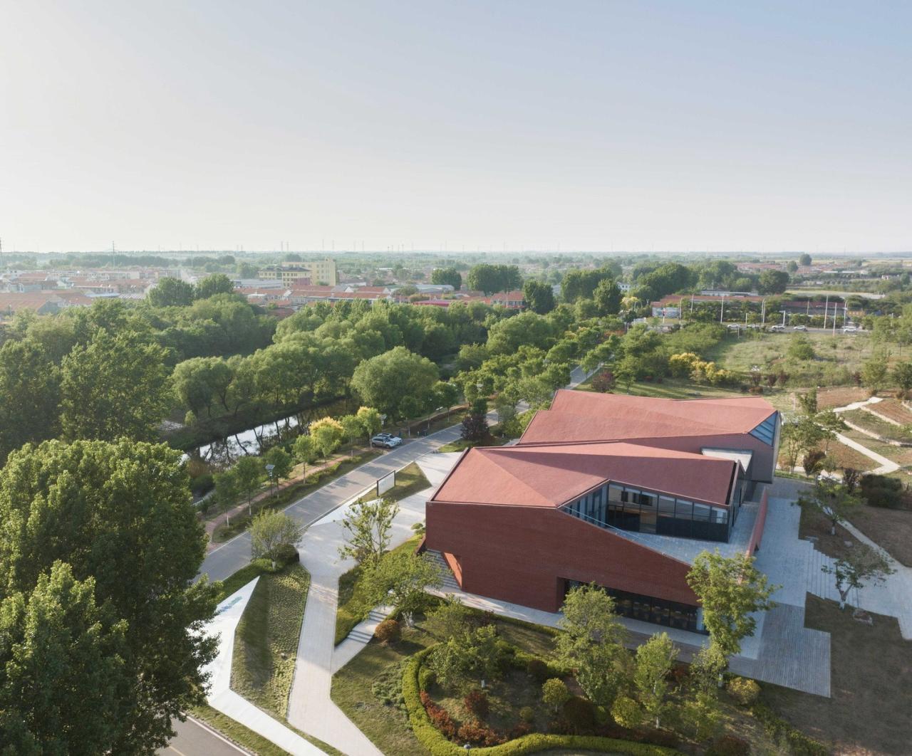 它有限度地从周遭选择需要回应的符号——红砖、U型玻璃幕墙和高透膜玻璃模仿石与玉的颜色及质感,与当地红瓦白墙的建筑风格遥相呼应。屋顶与墙面采用相同材料,实现上下包裹的一致性,让“玉”更纯粹。