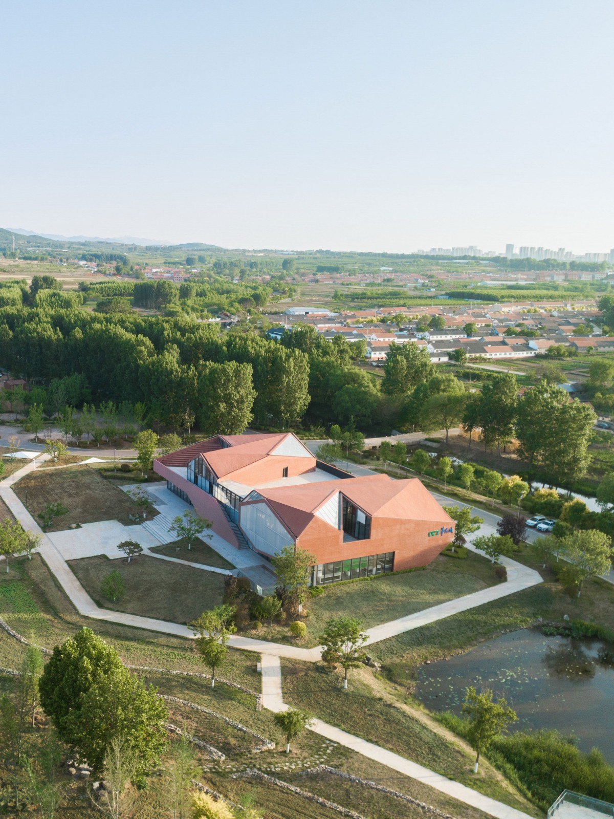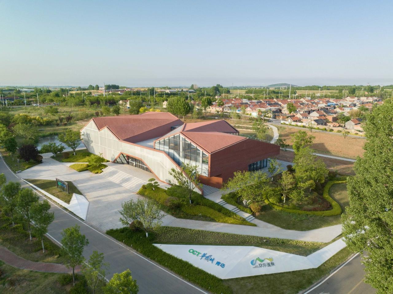 作为整体片区的先行示范单元,华侨城乡村展示中心装载着一连串以发展为名的“愿景”,是综合发展的激活点,它的周边是一连串青岛典型的红屋顶建筑,新建筑内里装载着产业布局、空间布局、展示销售的职能,亦以咖啡、轻食餐厅等业态拥抱未来的生活。