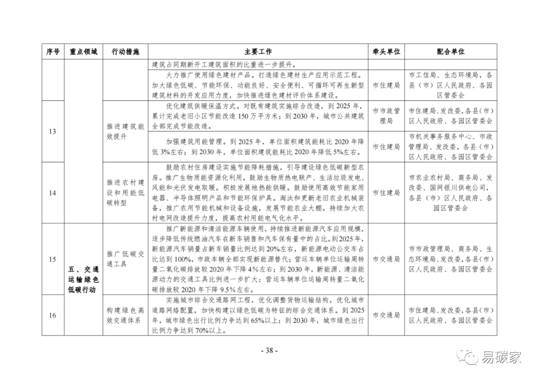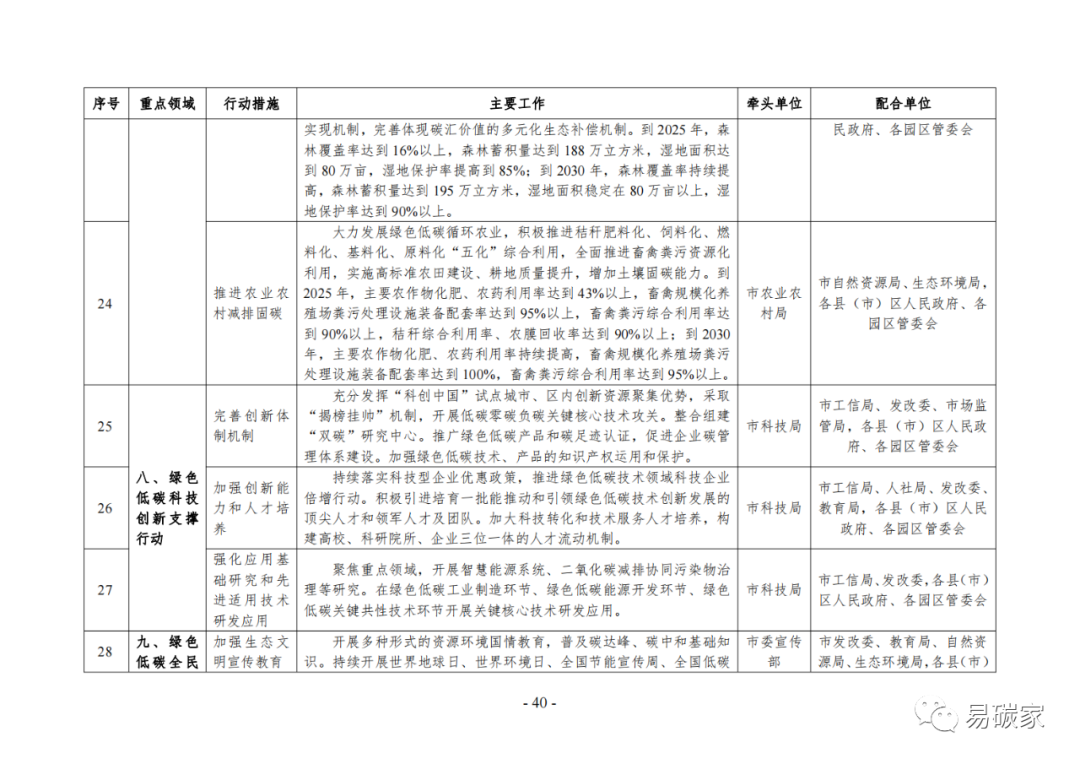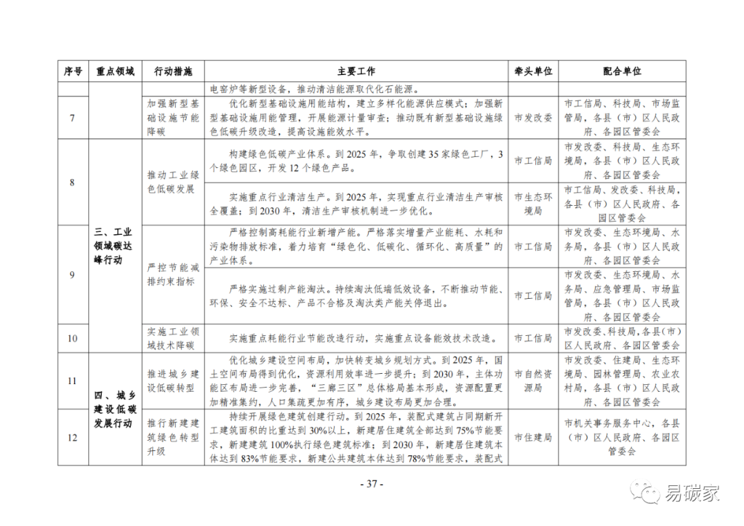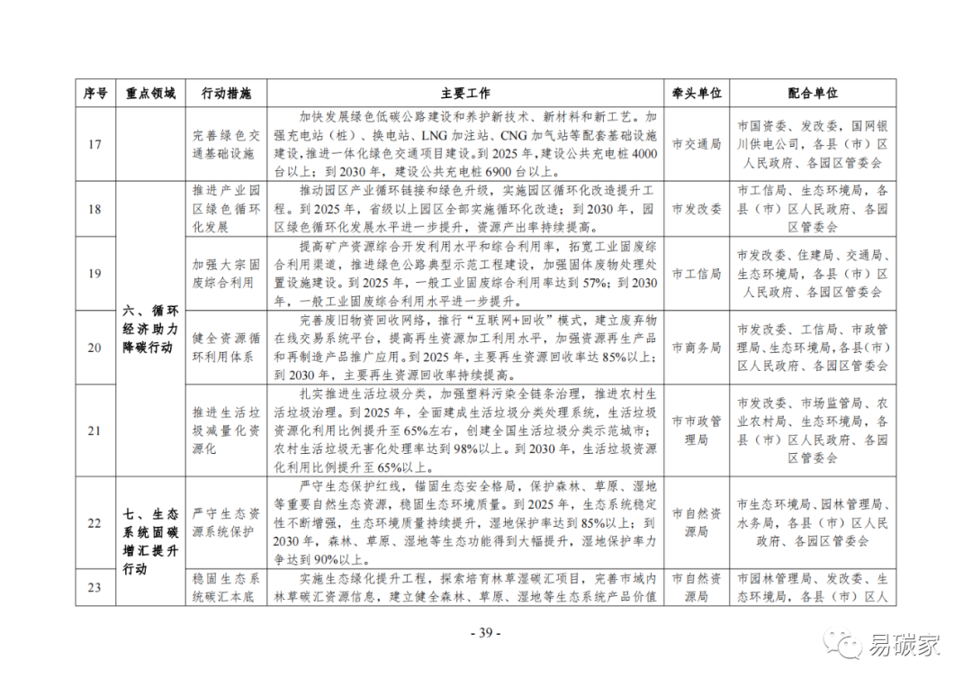 第三部分是重点任务,能源绿色低碳转型行动、节能降碳增效行动、工业领域碳达峰行动、城乡建设低碳发展行动、交通运输绿色低碳行动、循环经济助力降碳行动、生态系统固碳増汇提升行动、绿色低碳科技创新支撑行动、绿色低碳全民行动、各县(市)区梯次有序达峰行动十大领域重点任务。