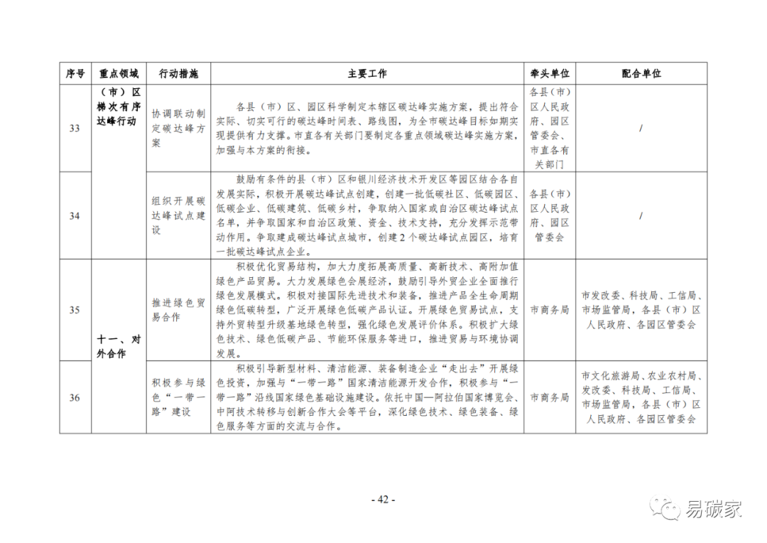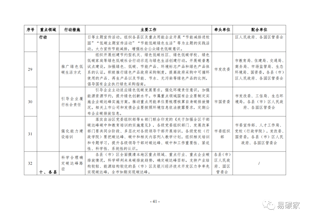 (三)重点任务说明。《实施方案》涵盖能源绿色低碳转型行动、节能降碳增效行动、工业领域碳达峰行动、城乡建设低碳发展行动、交通运输绿色低碳行动、循环经济助力降碳行动、生态系统固碳増汇提升行动、绿色低碳科技创新支撑行动、绿色低碳全民行动、各县(市)区梯次有序达峰行动十大领域重点任务,分34项具体行动措施内容。围绕银川市2030年前碳排放达峰的总体目标,以优化能源消费结构和产业结构、提高能源利用效率为重点突破口,着力落实相关降碳措施,结合不同行业领域特点,分别提出了不同的工作目标或指标,具体重点任务涵盖政策规划、行动内容、主要任务以及针对不同行业领域、政府部门、公众的建议,把碳达峰具体目标任务和碳中和远景目标要求融入到经济社会发展的方方面面。