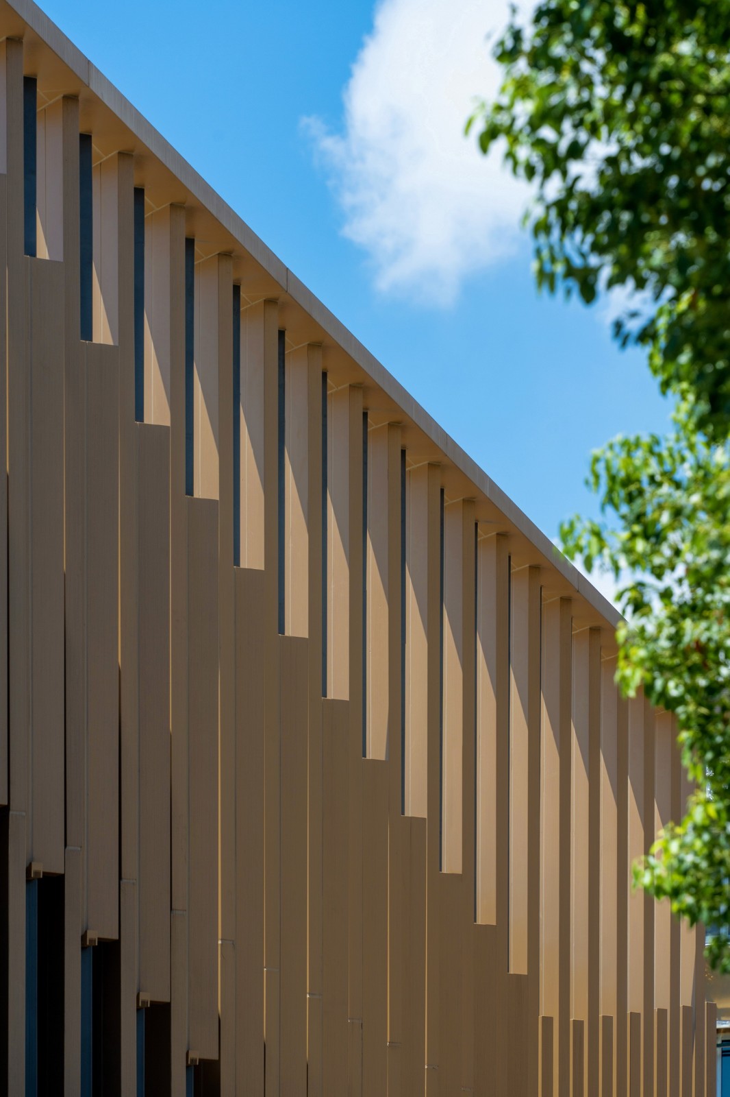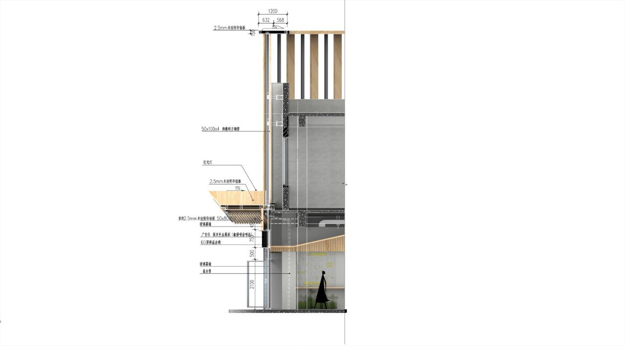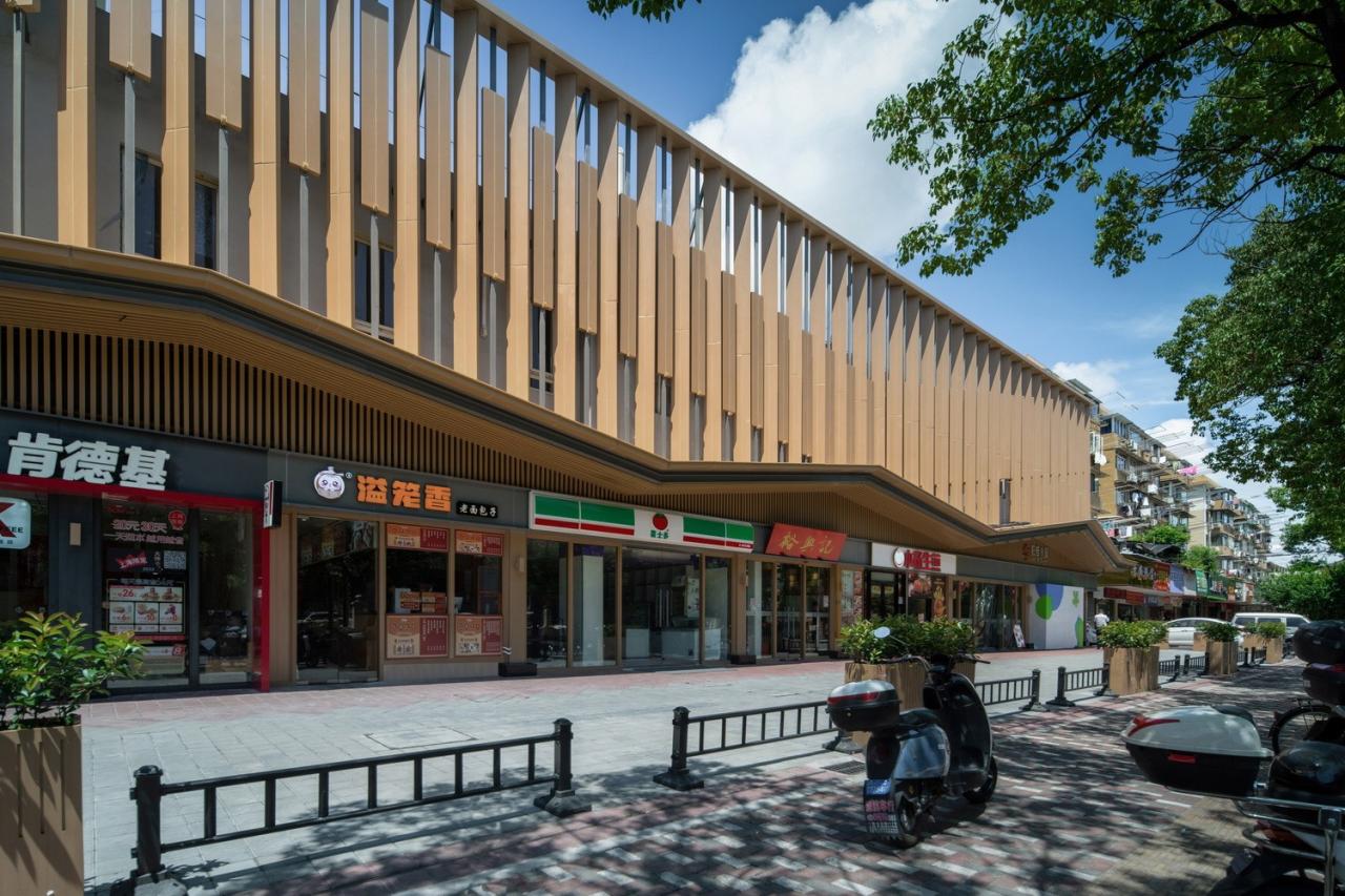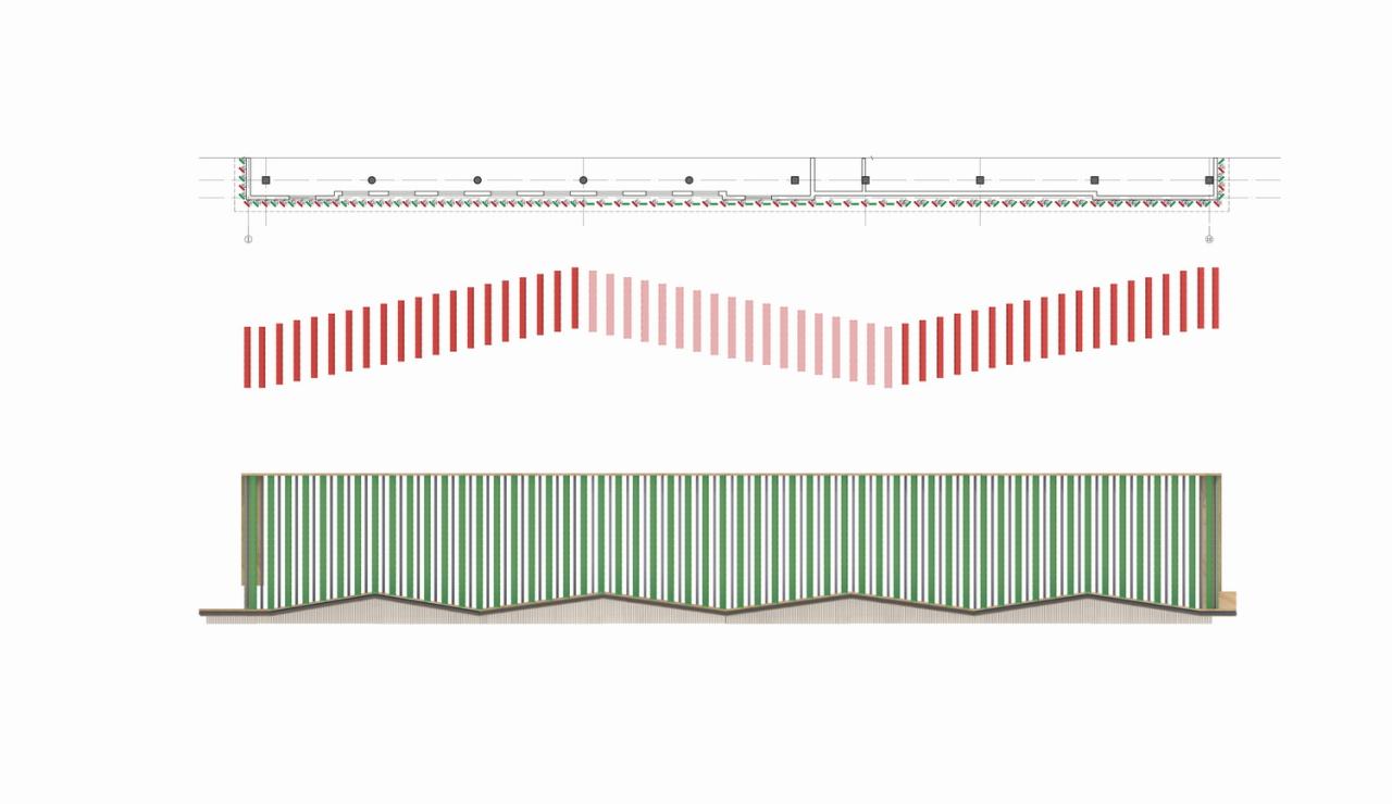 考虑到和周围的建筑环境相协调,我们选择以暖色系为整体基调,并采用“双表皮”做法对立面重新进行造型。格栅的疏密及角度变化模拟出“屋檐”折线,并随着视线和视角的变化而呈现不同观感。远远看去,屋檐连绵起伏,在沿街绿植的掩映下以低调的姿态融入环境。从近处看,格栅的比例和构件衔接清晰明确,为原本平淡无奇的沿街界面增添了细节和品质感。