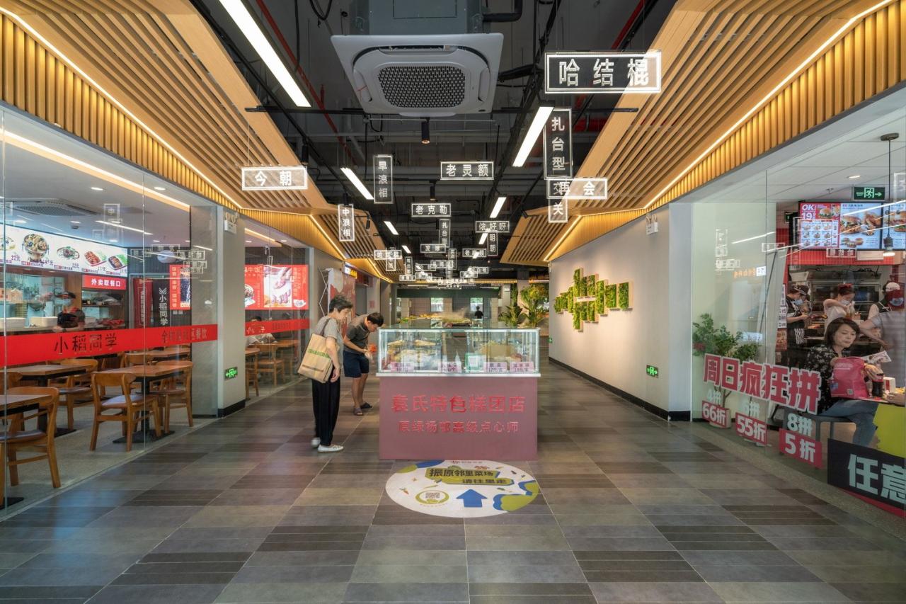 回溯菜场在不同时期的空间形态演变,我们发现大家对菜场的记忆并不是某些具体的事物,反而是街边一个简易的棚下或是檐下热热闹闹,挤挤挨挨的氛围。为此,我们有意让“屋檐”成为一个文化符号,通过建筑立面、室内空间的整体诠释,唤起每个人对菜场的场所记忆。这一方面是对勤海项目“同一屋檐下”理念的延续,保证“阳普邻里”品牌的一致性;另一方面,“屋檐”也是建筑立面和室内的主要形式表达,构成“记忆——空间——功能”深度融合的设计体系。