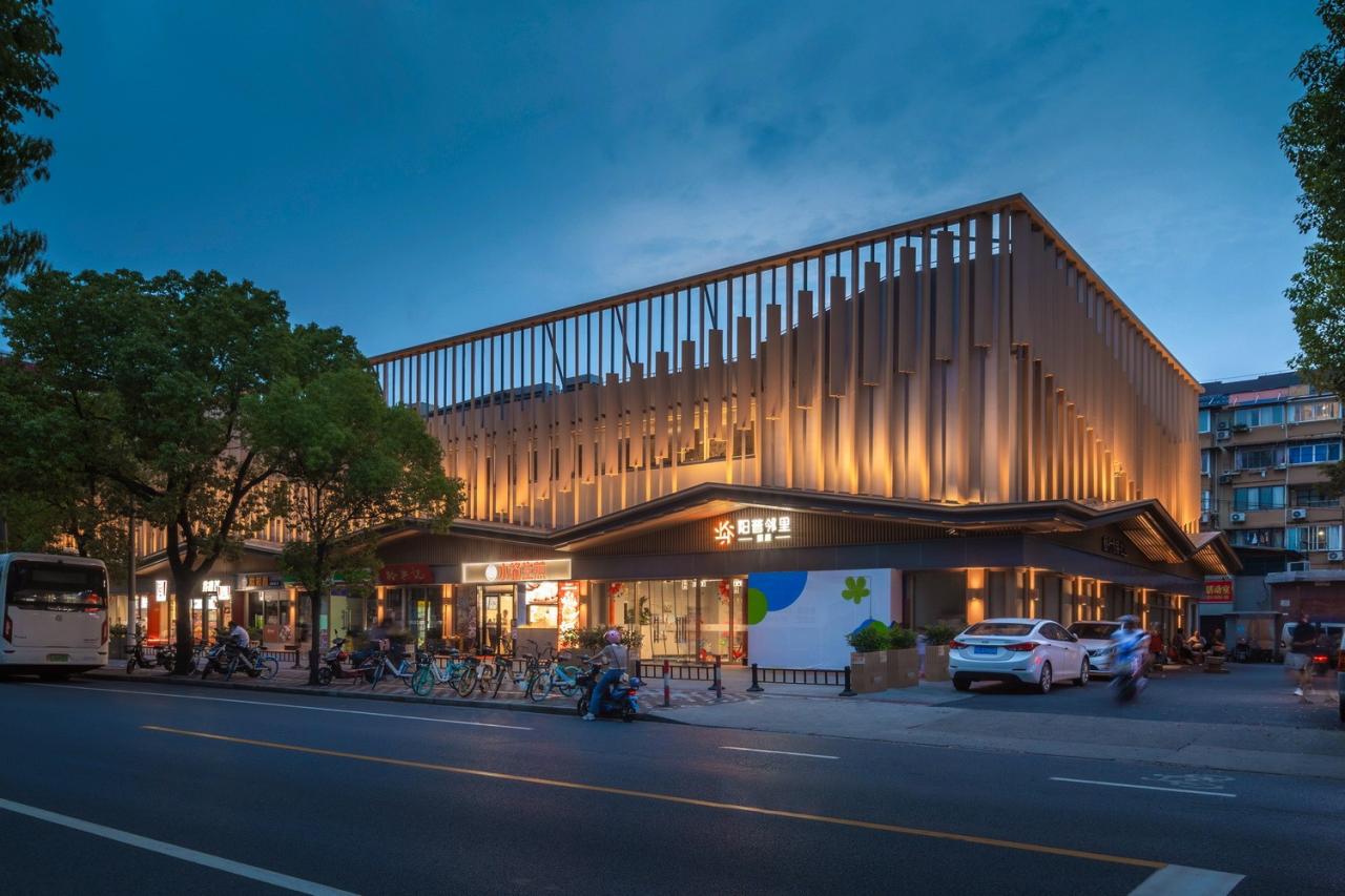 夜晚,疏密有致的格栅在暖黄的灯光洗照下绵延、摇曳,像一条永不停歇的夜市,守候城市的烟火和晚归的灵魂。
