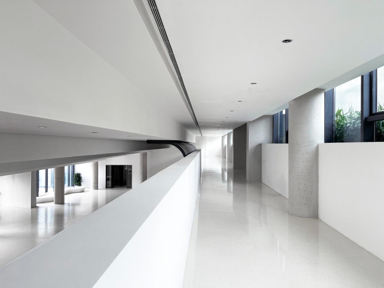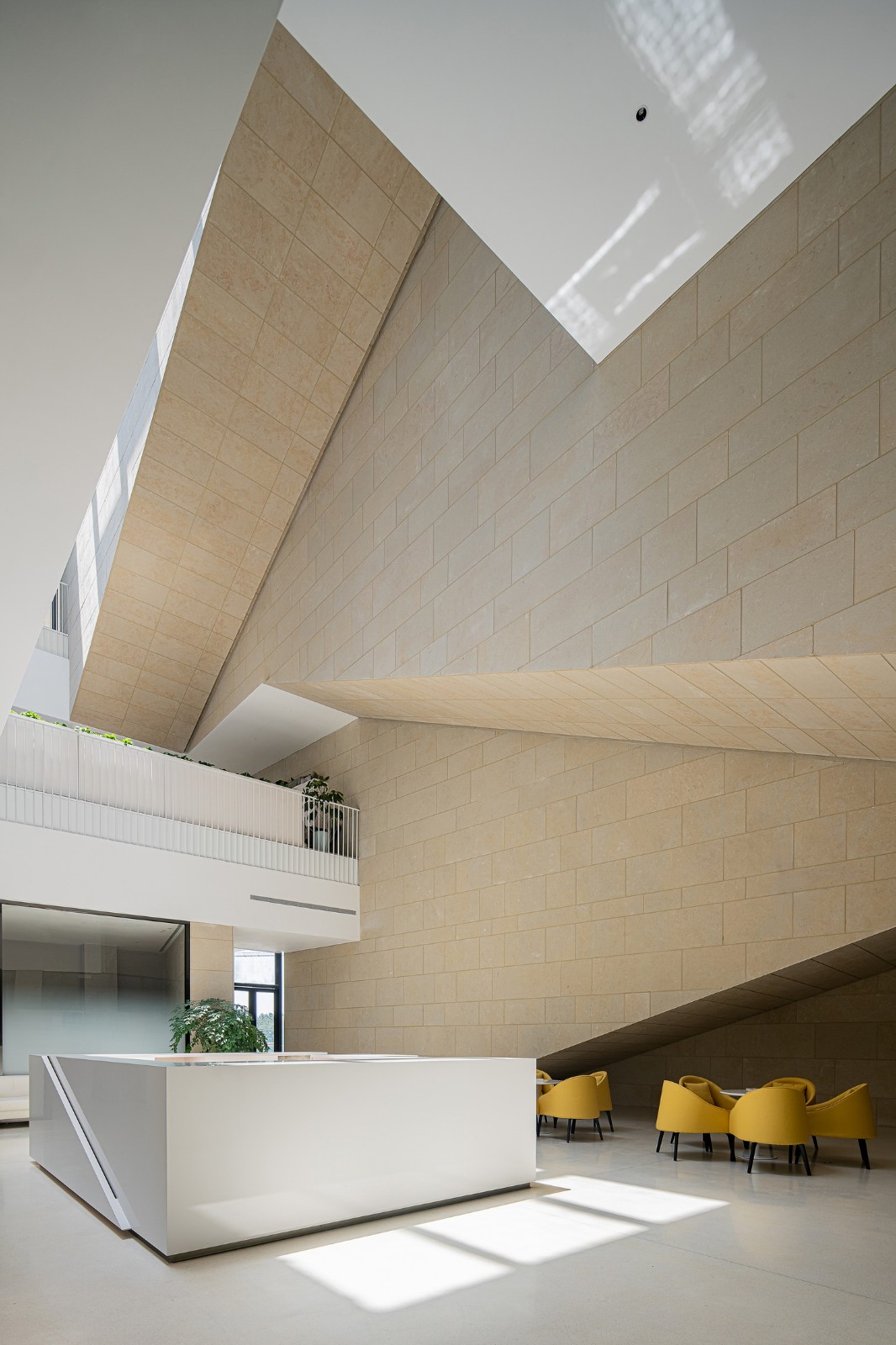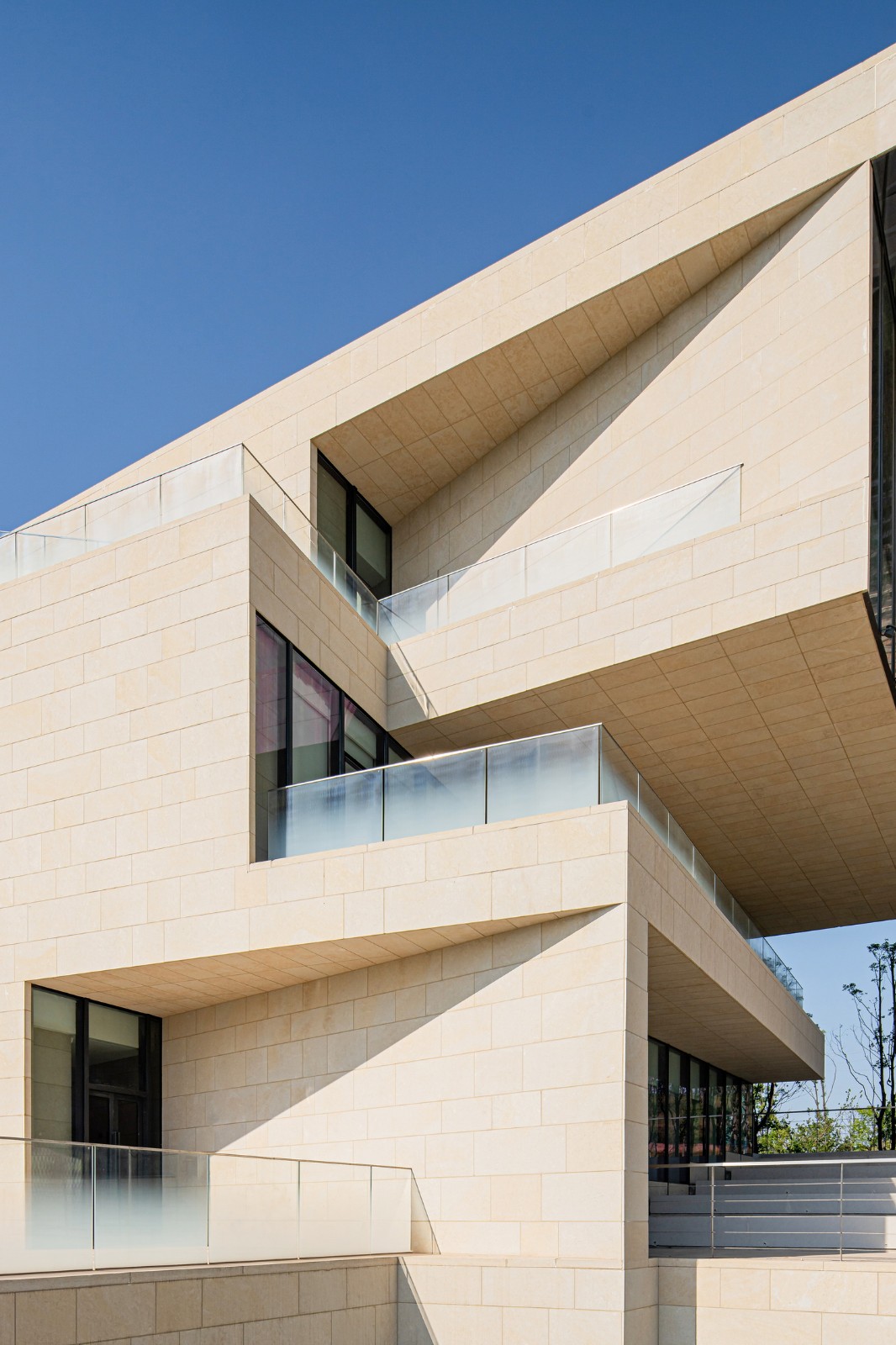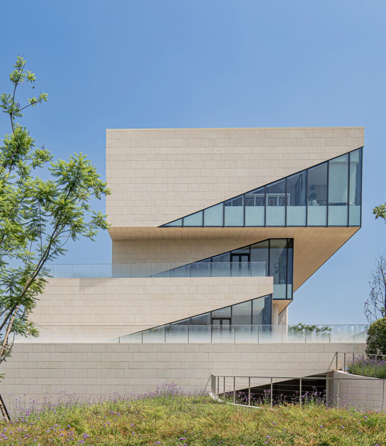 建筑开窗主要集中在东立面,为不同功能的空间提供充足的采光通风。西立面作为主要展示面,同时避免西晒,采用了封闭的石墙面。中部的洞口通过两侧建筑不同楼层的错叠,形成负复杂的轮廓。西立面石材包裹的体量以层层退台的方式形成室外平台,折返的台阶联系各层平台,在西立面上勾勒出简洁有力、连续向上的路径,由低到高直至屋顶平台,贯穿整个立面。一方面满足安全疏散要求,减少建筑内部交通空间冗余;另一方面弱化建筑体量的压迫感,带来更多的形体变化。更为重要的是方案在此进一步调动观众的动线,在不同高度及屋顶获得领略建筑与周围环境的不同视角,这里是以现实场景的方式展示新城建设过程的平台。