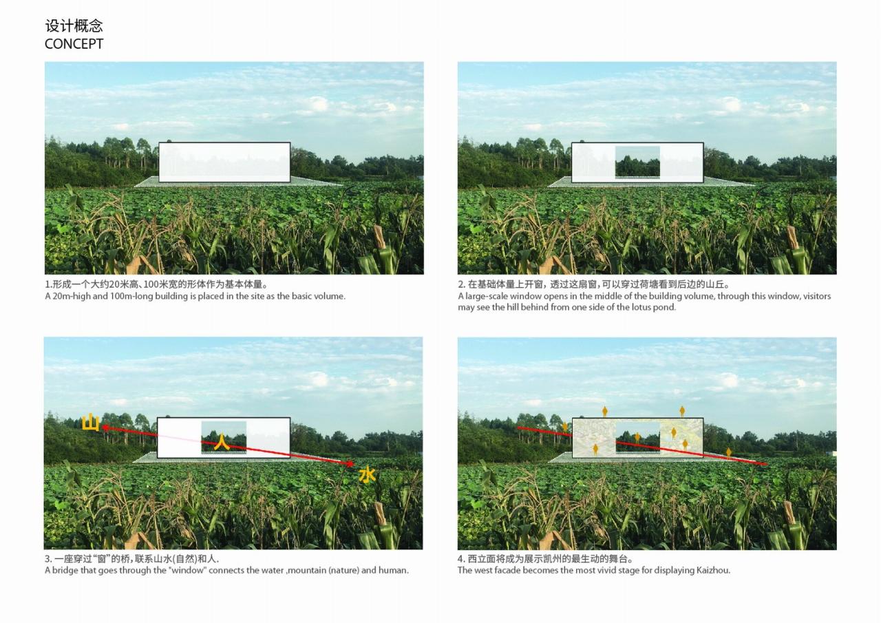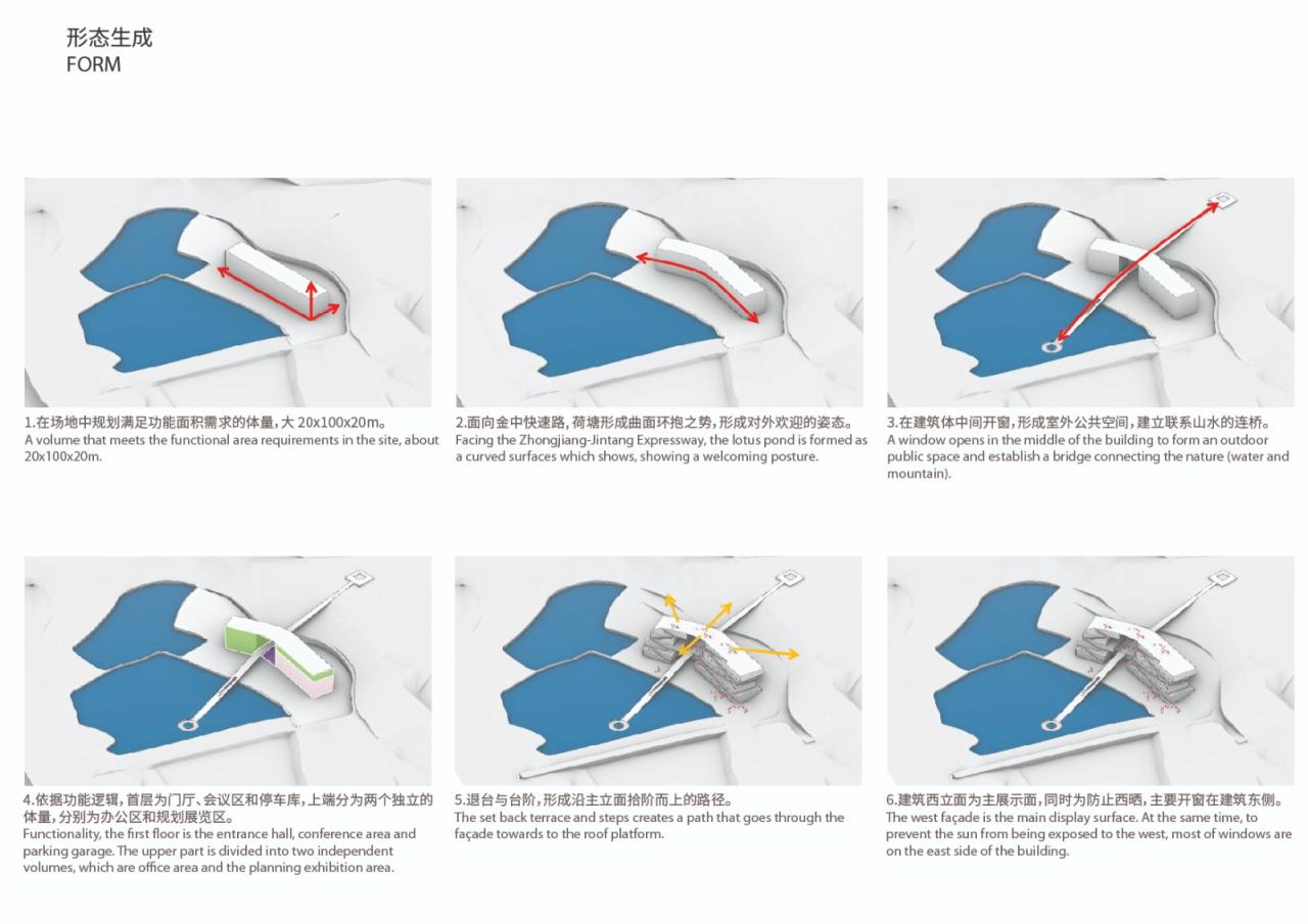 方案结合功能需要,形成一个20米高、100米长的形体作为基本体量。同时,设计一座穿过建筑,连接荷塘与山顶的廊桥,与建筑体量形成交叉关系。由此,建筑体量的中部被打开了一个大尺度的洞口,既形成室外公共空间,又进一步强化这种对话关系。穿越洞口的廊桥让人在荷塘与山丘间建立起联系,将建筑作为欣赏自然的窗口。原本并非宏大和独特的山水场域,借助观察洞口的视觉约束和释放,提示着山水情景的存在,并使观者获得新的心理体验。