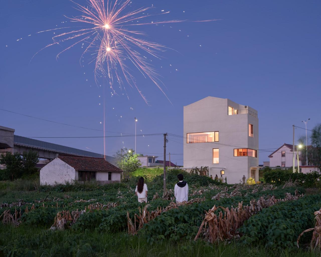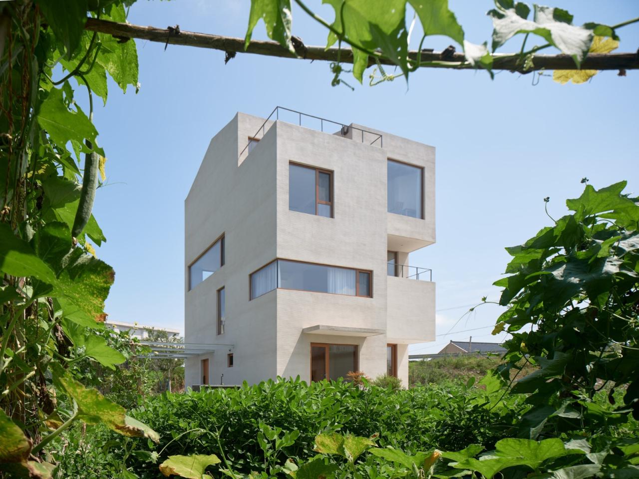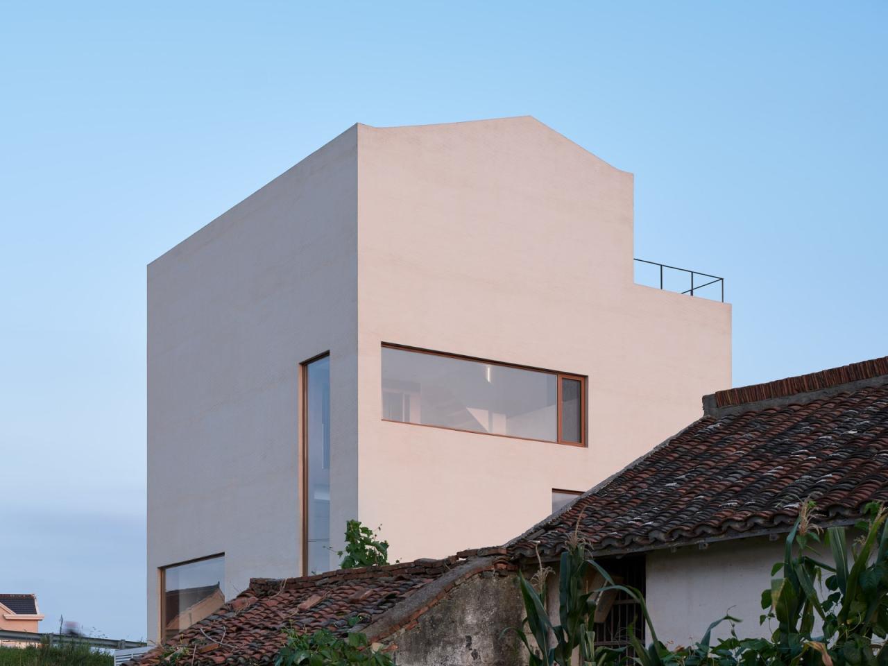 基地位于村庄尽端,背靠高铁与公路,车辆的轰鸣声不绝于耳。因此彭宅面向公路和铁路的东侧与北侧都几乎没有开窗,使它如同一座碉堡,顽强地抵抗着滚滚而来的城镇化浪潮。彭宅可开启的窗户都位于面向村子的西侧与南侧,为避免可能导致无限期停工的村民举报,建筑没有任何超出基底轮廓的出挑。彭宅谨慎小心地与这片熟悉又陌生的田野对话,仿佛一个试图归来的旅人。