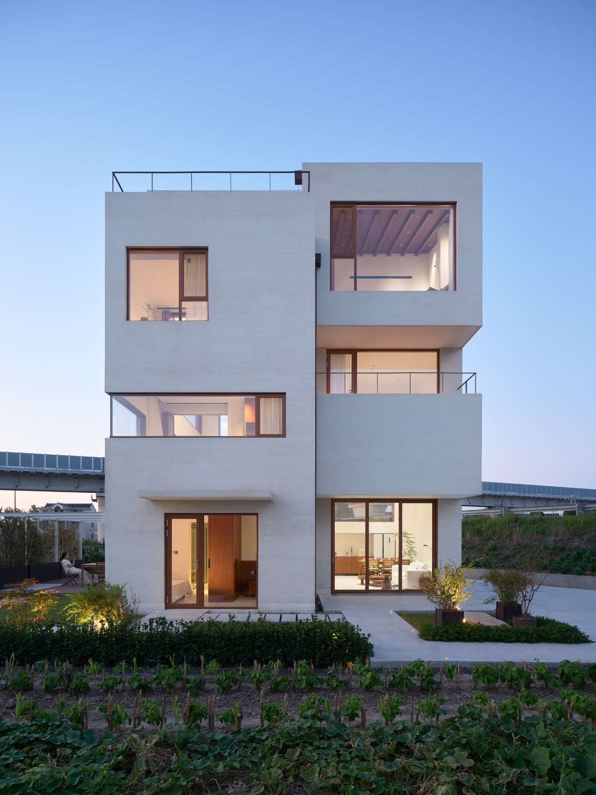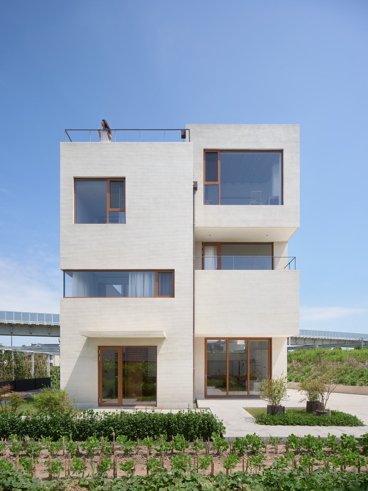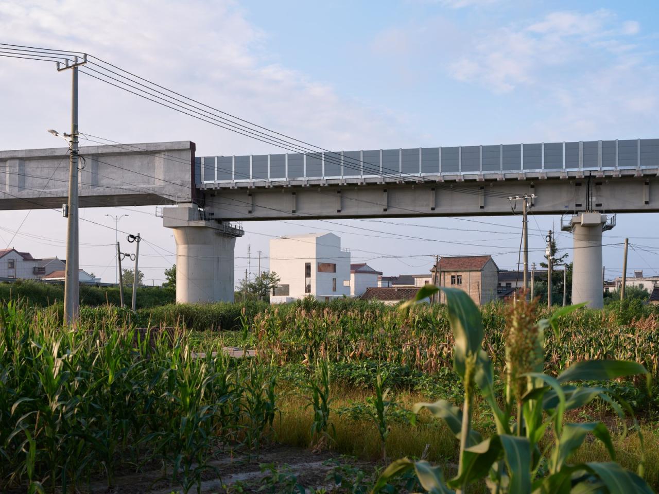 基地位于村庄尽端,背靠高铁与公路,车辆的轰鸣声不绝于耳。因此彭宅面向公路和铁路的东侧与北侧都几乎没有开窗,使它如同一座碉堡,顽强地抵抗着滚滚而来的城镇化浪潮。彭宅可开启的窗户都位于面向村子的西侧与南侧,为避免可能导致无限期停工的村民举报,建筑没有任何超出基底轮廓的出挑。彭宅谨慎小心地与这片熟悉又陌生的田野对话,仿佛一个试图归来的旅人。