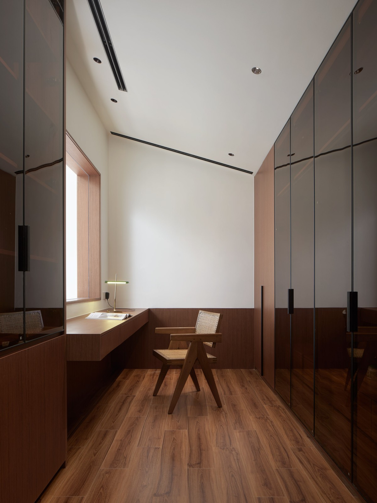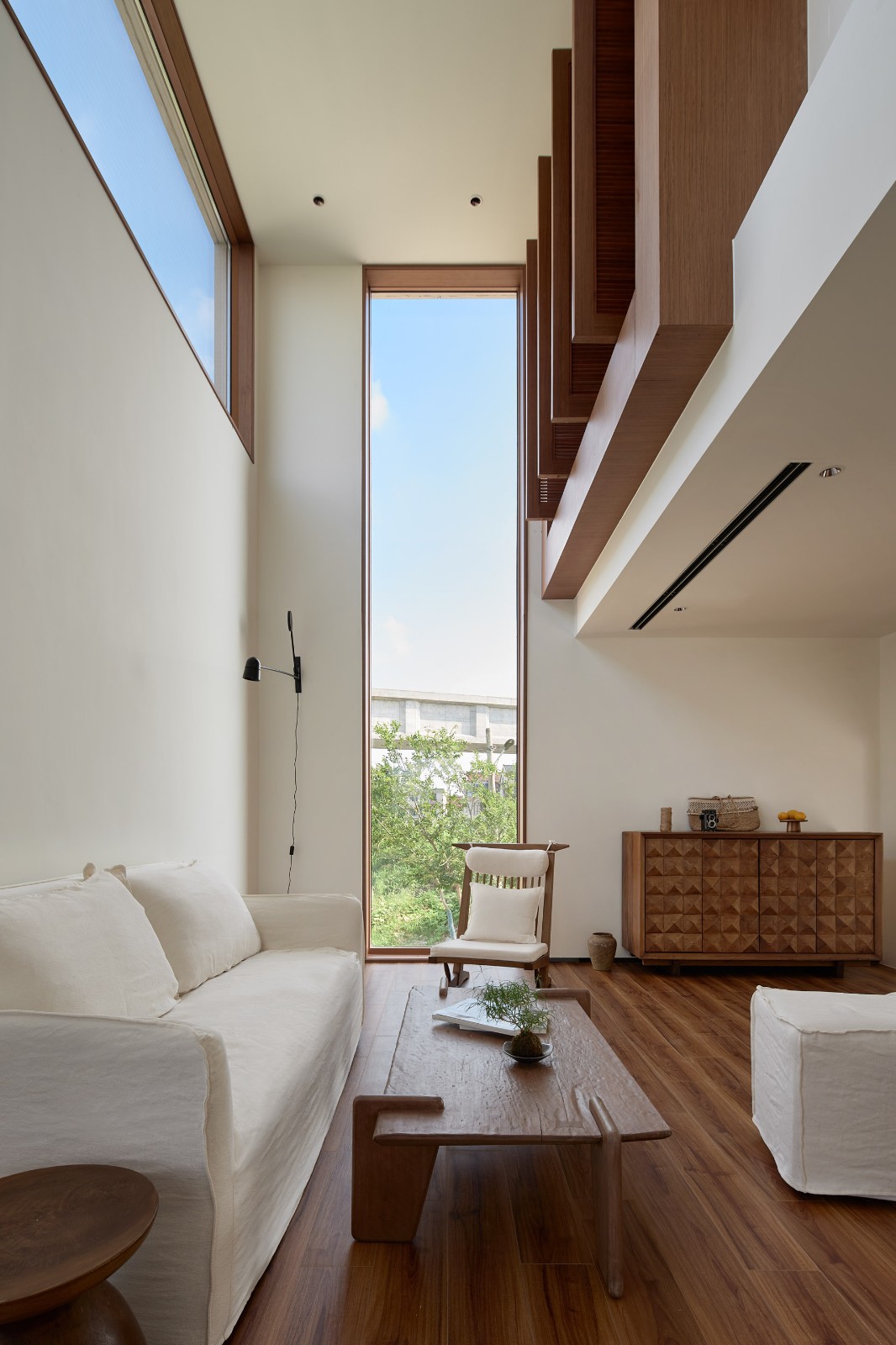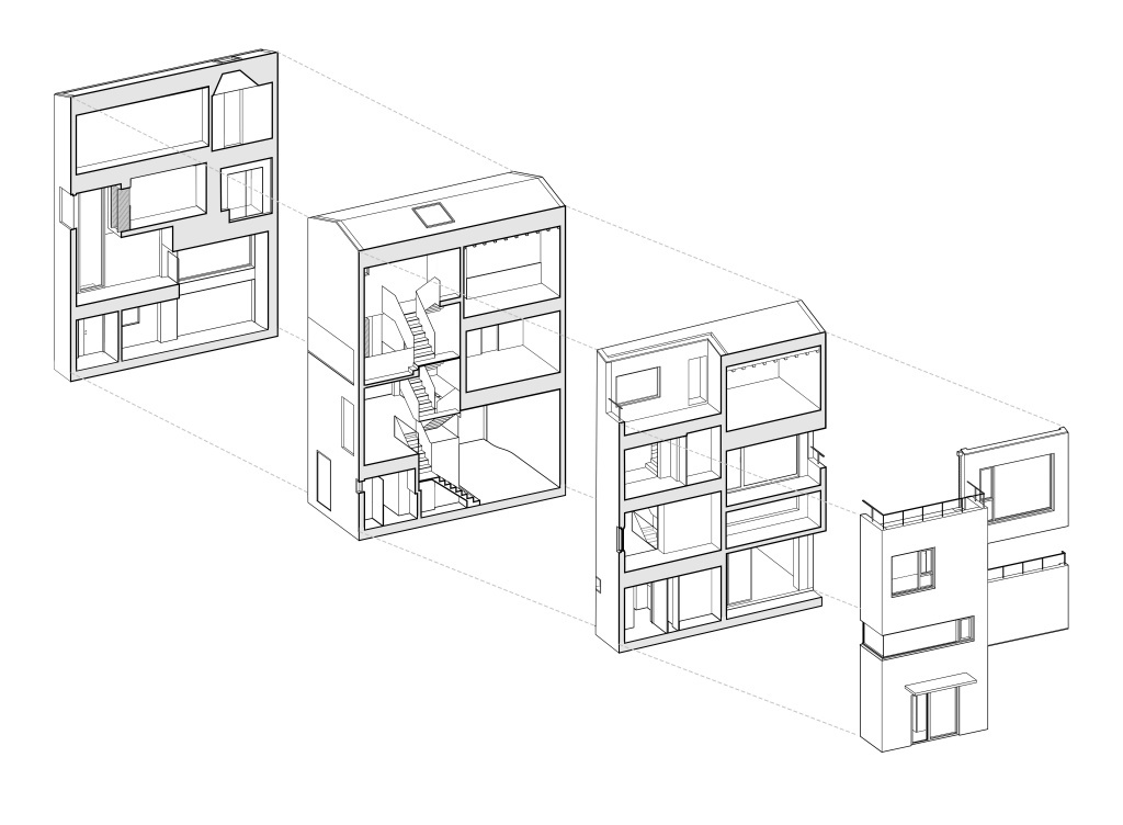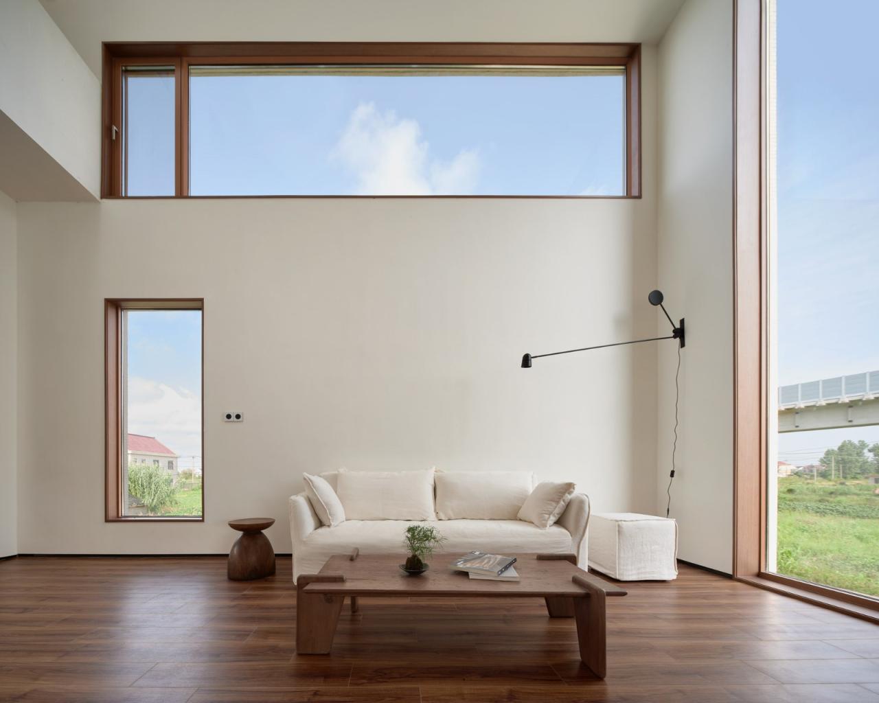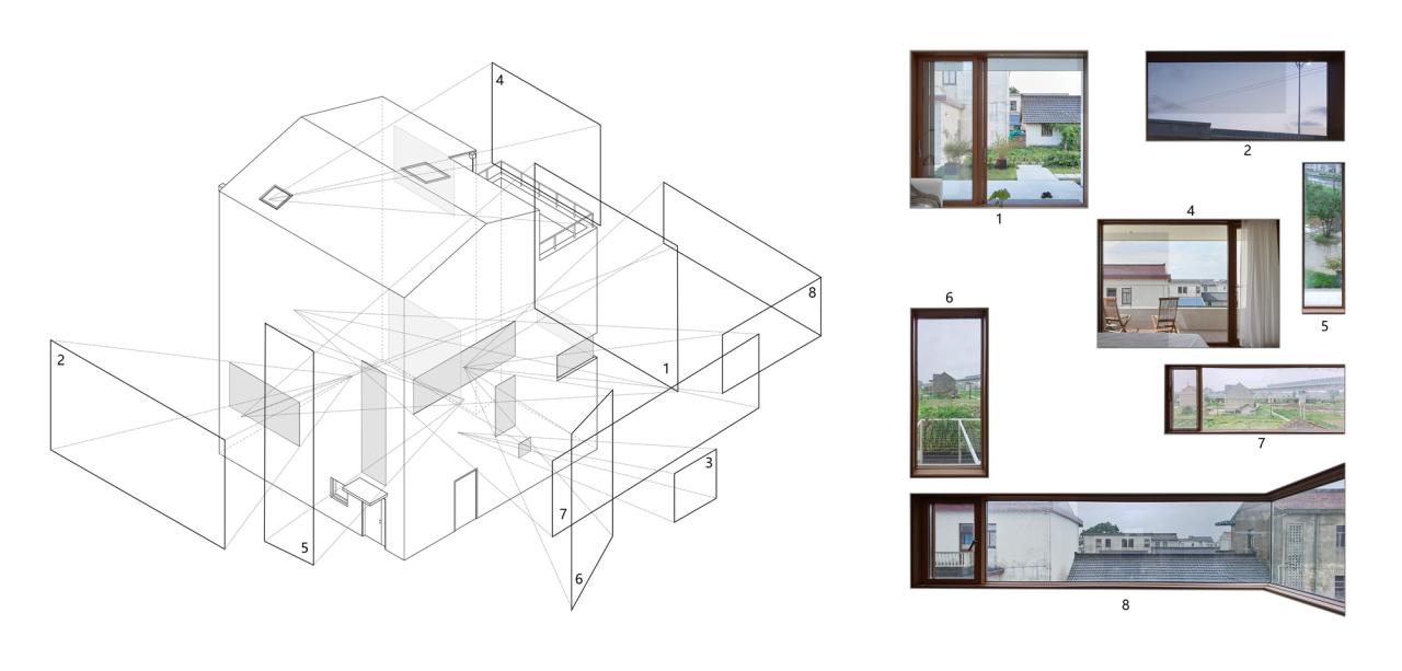 建筑南侧三层四层以两个相互咬合并错动退让的阳台形成立面上“crossing”的关系,三层儿童房的内阳台和四层主卧的露台呈对角线设置,与同样呈对角设置的三层客卧和四层主卧的方形玻璃窗构成了“X”,这种在垂直方向的纵深变化使得不同房间的风景变得富有层次,是一种“纷至沓来”的诗意,消解了水平、垂直、斜向与内外空间的边界,也消除了过极小基底面积下“火柴盒”轮廓带来的敦实感。建筑它以坚实和脱离的背影与象征速度与陌生的城市告别,而用柔软与开放的面庞朝向日渐衰老与凋零的村庄。南侧二层书房设置转角玻璃窗,延伸到西侧,间之以似窗似门的透明洞口,紧接着便是三层高度上的横向长窗。西侧洞口横竖的几何变化削弱了山墙实面的厚重感,也为三层儿童房的书房提供了内化的风景。北侧唯一的两个洞口正是一层客厅和二层起居室的通高,建筑内部空间关系以最直白的几何语汇反映在立面,也是对室外朴树景观的借景。