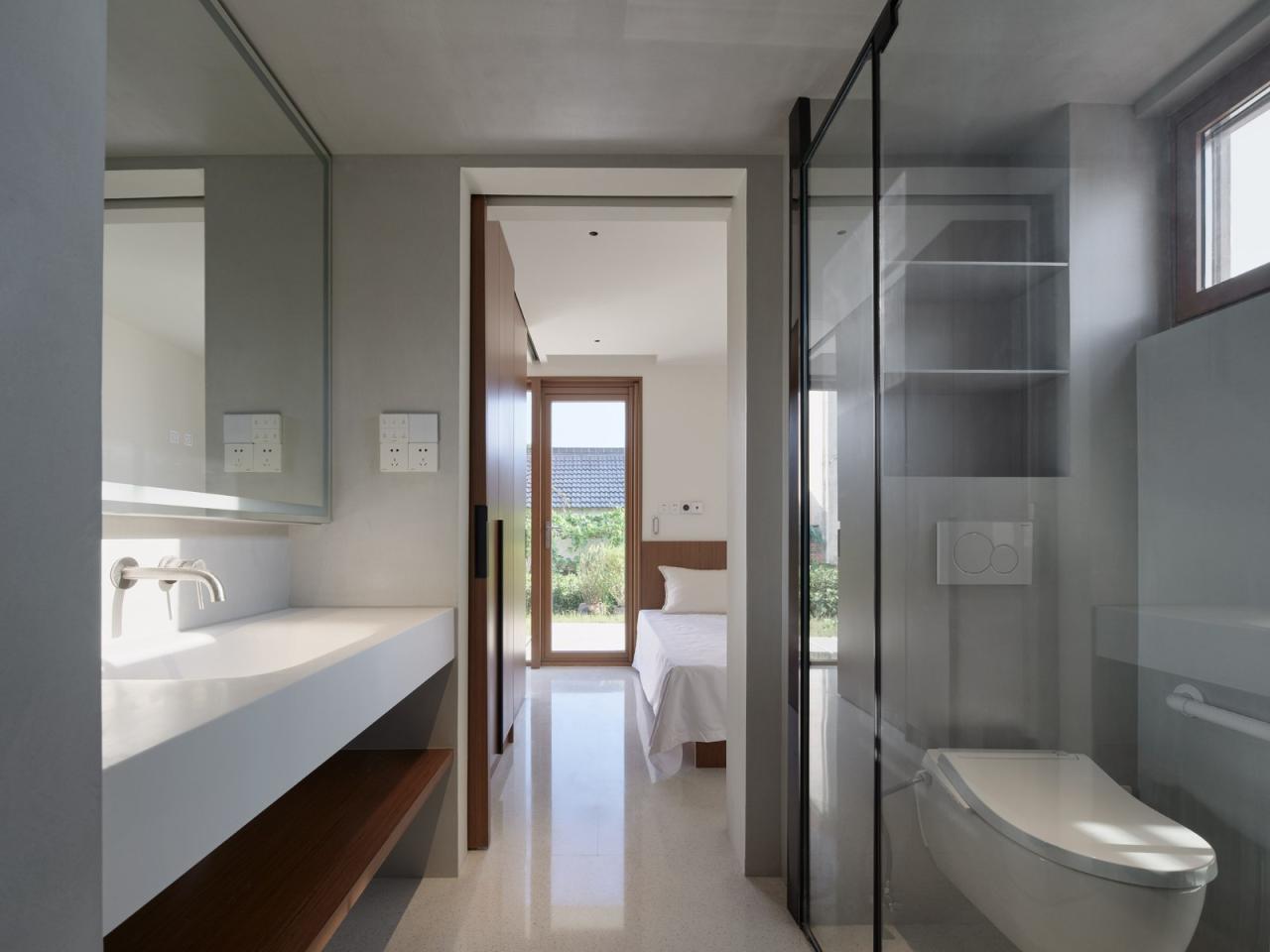 乡村生活没有秘密,乡邻们会随时到访,彭宅因循乡邻的普遍作法,也不设院墙。设计一层延续了传统的堂屋与厢屋的空间组合,堂屋大门常开,厢屋为老人居室,“一堂一厢”适应老一辈的日常生活,户型细节在传统格局的基础上进行了适老优化。过去堂屋正中对景一般为香案,挂中堂画,作为祭拜所用。新彭宅已无此类需求,设计将这一对景转译为西厨与高窗,蓝天白云入画,也为堂屋带来柔和的照明。新彭宅一层使用与老宅一致的水磨石地面,老人和乡邻进出大多经过泥土地,鞋底较脏,水磨石结实耐用、方便打理。老人房的双卧室设有独立对外的门,白天常开,也可以通过西侧门与葡萄架直接相连,乡邻们也时常来小坐。和风穿堂、往来闲谈,这是家中50后老一辈所熟悉的,属于乡村熟人社会的生活方式。