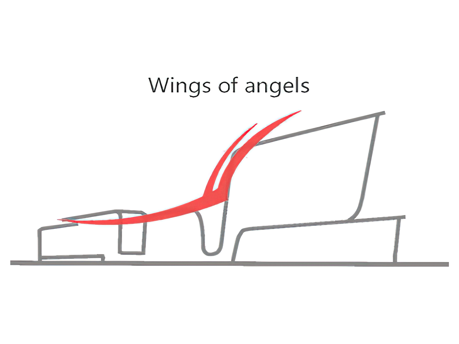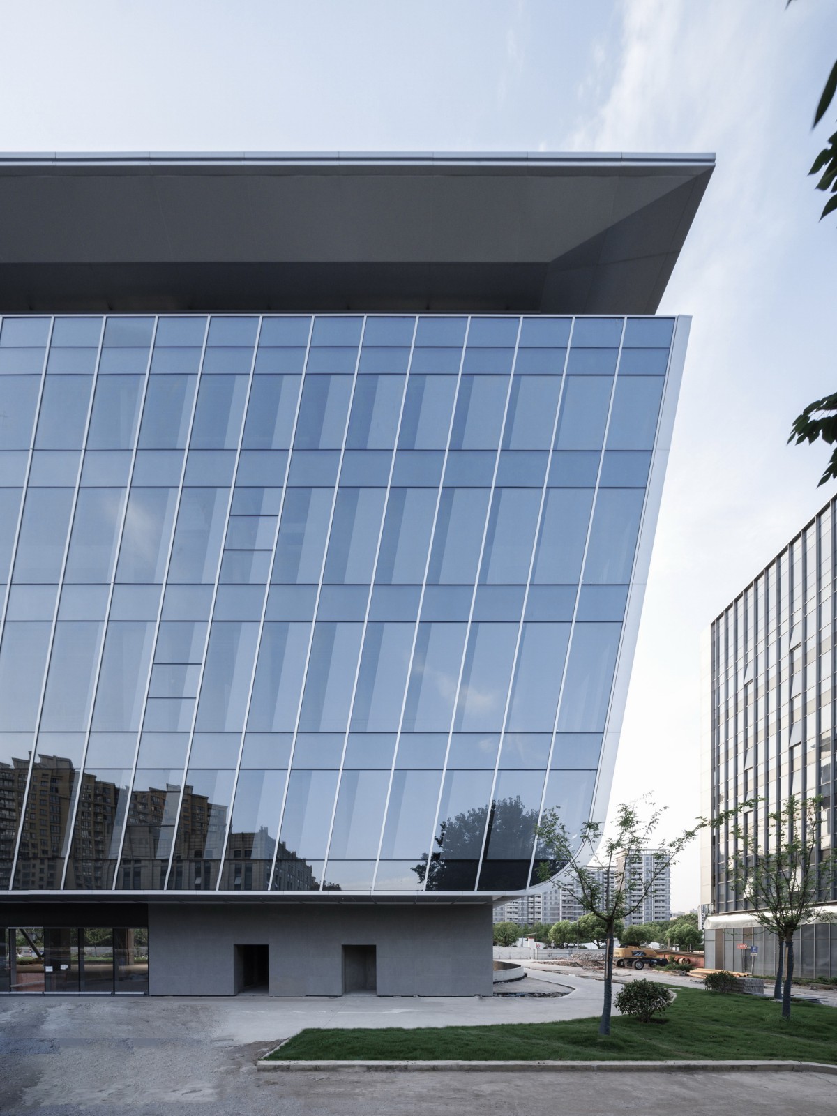 塔楼及裙房均采用斜向立面,设计以半包裹的银灰色铝板勾勒出塔楼与裙房的形态动势,强化建筑的速度感与未来感,并利用两端悬挑的飘板为建筑带来了漂浮和水平延伸感,而两翼内切的悬挑式铝板线条又为立面添加了些许灵动,整体造型如同即将展翅起飞的雏鹰。
