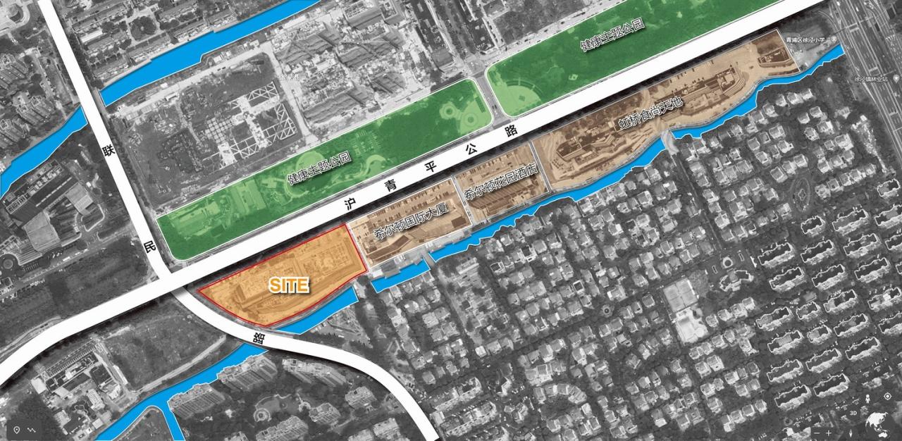 基地东侧现状为灿辉国际大厦、希尔顿花园酒店和虹桥食尚天地商业中心,商业氛围浓厚;基地北侧为健康主题公园,南侧濒临优质河流,景观资源丰富,作为徐泾镇门户,具有广阔的发展前景。