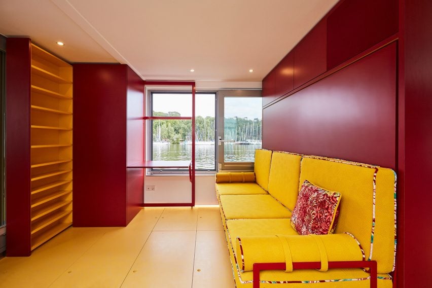 整个船只采用了一致的红黄配色,参考了中国的皇家色彩,并反映了客户在北京度过的时间。伦哈特说:“我们遵循的逻辑是,所有改造家具的元素都是红色的,一旦打开,就会露出黄色的内部。”