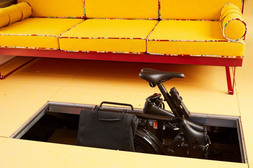 隐藏在这个床单元后面的是一个滑动门,当多个乘客登船时,可以将其拉出以提供隐私。在“放松船”的客厅中央,跨界工作室使用了一块地板来伪装地板下的自行车存储单元。