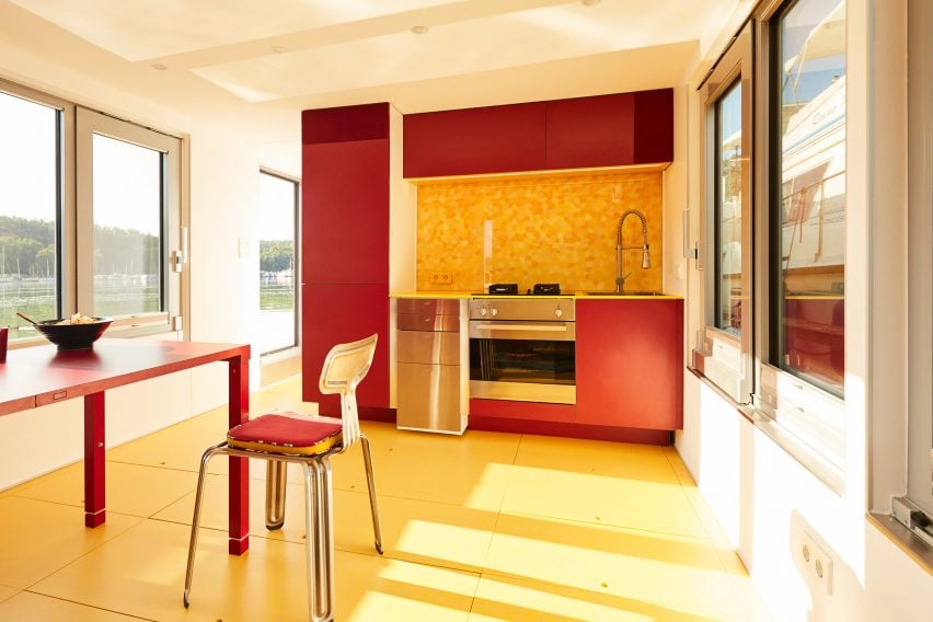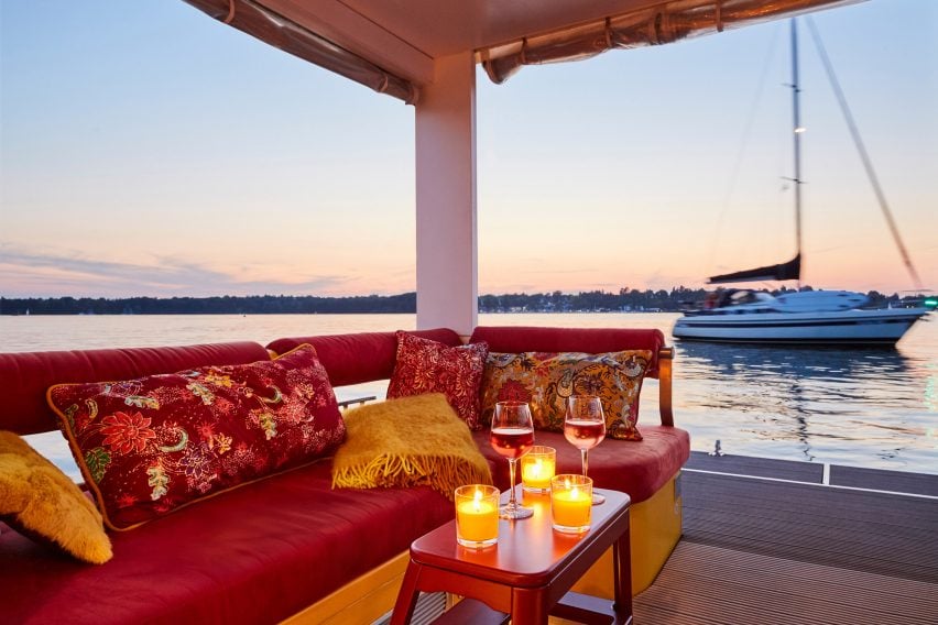 船的尽头是一个带有红色橱柜的厨房,还有一个可移动的餐桌,可以通过多种方式连接。在船的这一端还有一个额外的折叠床,用来隐藏船的控制装置,给房子一种更居家的感觉。当拉出时,这张床突出到控制甲板上方,周围有大窗户,可以看到水的景色。在外面,“放松船”的甲板上有一张长沙发,沙发上有客户多年旅行中收集的花纹织物。