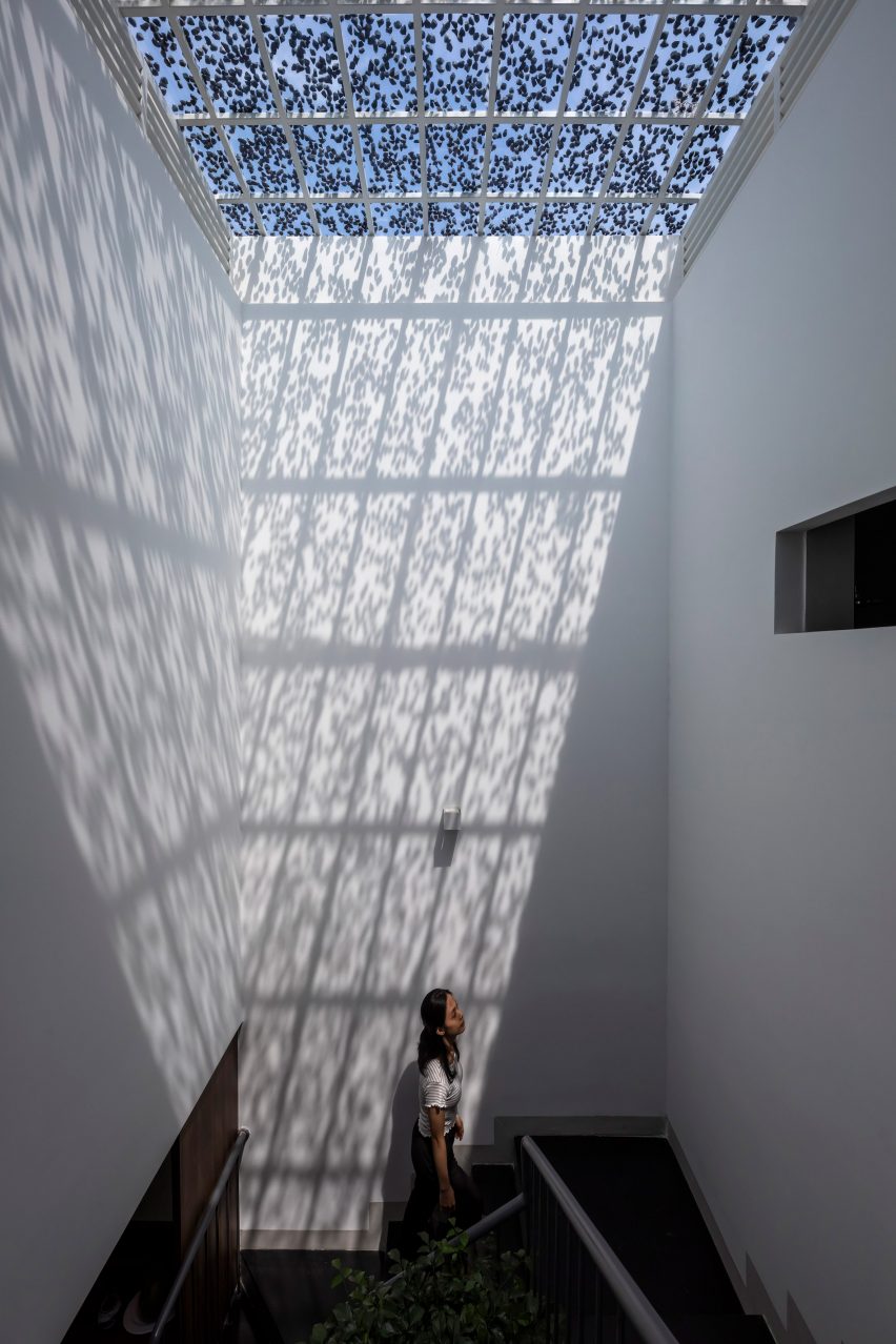 由于场地狭窄,天窗被用来将光线和空气引入房屋的中央和后部。它们上面有一层薄薄的石头,以减少眩光,并在里面形成斑驳的阴影。CTA工作室解释道:“在分析了联排别墅的典型缺陷后,团队将绿地、自然光、自然通风和防噪音标准列为设计过程中的首要任务。”CTA工作室说:“室内空间总是充满自然光,但不热。此外,石头层的阴影通过树叶产生了类似于阳光的效果,有助于增加自然的感觉。”一个天窗楼梯通向J House房较小的一楼,前面有一个额外的卧室、浴室和露台空间,后面有一个金属框架凉棚遮蔽的屋顶花园。