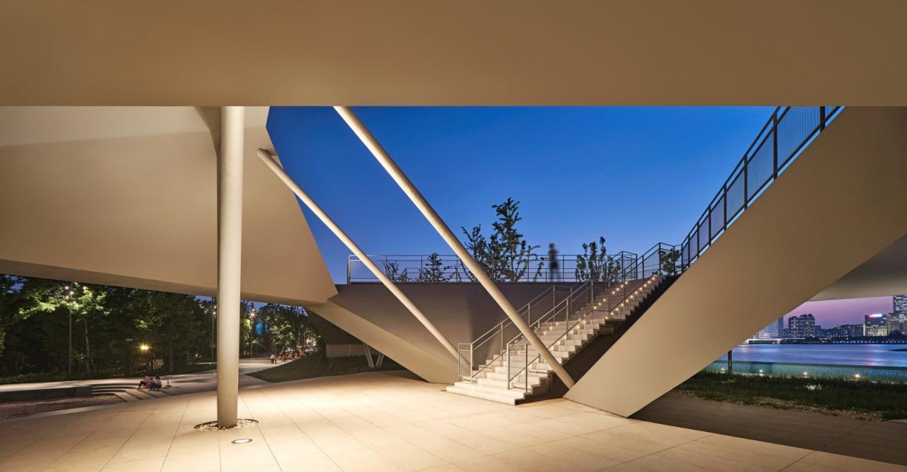 功能性响应——云渡驿总建筑面积1945.4平方米,为地下一层、地上一层建筑,地下层为混凝土结构,地上层为钢结构,建筑长度104m、宽度30m、高度7.9米。驿站所在的场地原为钱江三桥东侧的邮轮奥体码头,随着杭州亚运会的即将开幕,云渡驿承载着原址码头的使用功能与新环境下的城市基础服务体系。基于此,设计以一种场地手术般的操作,通过结构和形体的上下翻折与公共活动屋面的营造,在形态与功能上将建筑与场地平滑地衔接起来,模糊城市图底关系中原本清晰的边界,提供更多人与人在此相遇的可能。为了实现“漂浮的蓝道”与长卷般变换的景色序列,云渡驿将卫生间、管理用房、设备用房等辅助空间隐匿于地下,地上采用钢结构,整体为四个落地菱形体块的重复排列,每个体块均由一对平行斜杆及一对V型斜杆支撑,以四个体块托举屋面。结构通过合理找形,在实现大悬挑的同时维系了轻盈的建构尺寸,檐口厚度仅200mm,营造了漂浮、通透的建筑效果。云渡驿以其内与外、远近景、人工与自然的融合形成了连续、互动且丰富的空间。亚运会的举办将为云渡驿及其所在的三桥亚运公园注入事件性的特征,而亚运会期间码头集散、休憩观景、运动体验等功能,未来将弥散于日常,云渡驿将回归一个可以进入的“城市场所”,为人们提供多样活动的舞台。