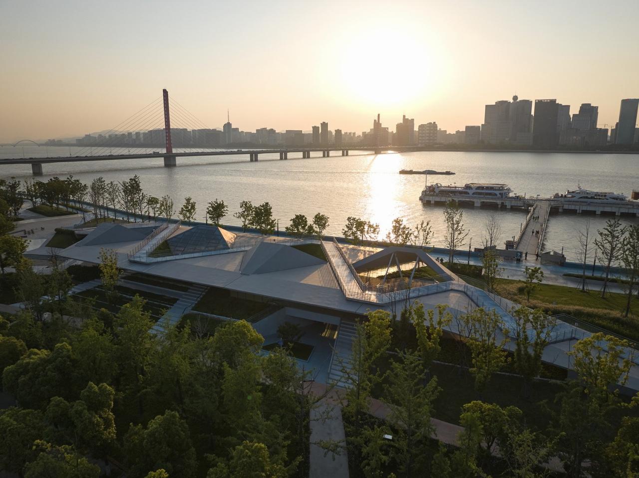 三桥亚运公园位于杭州市滨江区钱塘江南岸,钱江三桥以北,与南侧奥体中心“大莲花”隔闻涛路相望。设计以“构筑一条城市性、人文性、生态性、智慧性、在地性、前瞻性相融合的钱塘江新水岸”为目标,是同济大学建筑设计研究院(集团)有限公司·原作设计工作室所承担的杭州市滨江区12公里滨水公共空间改造提升项目的先行段。