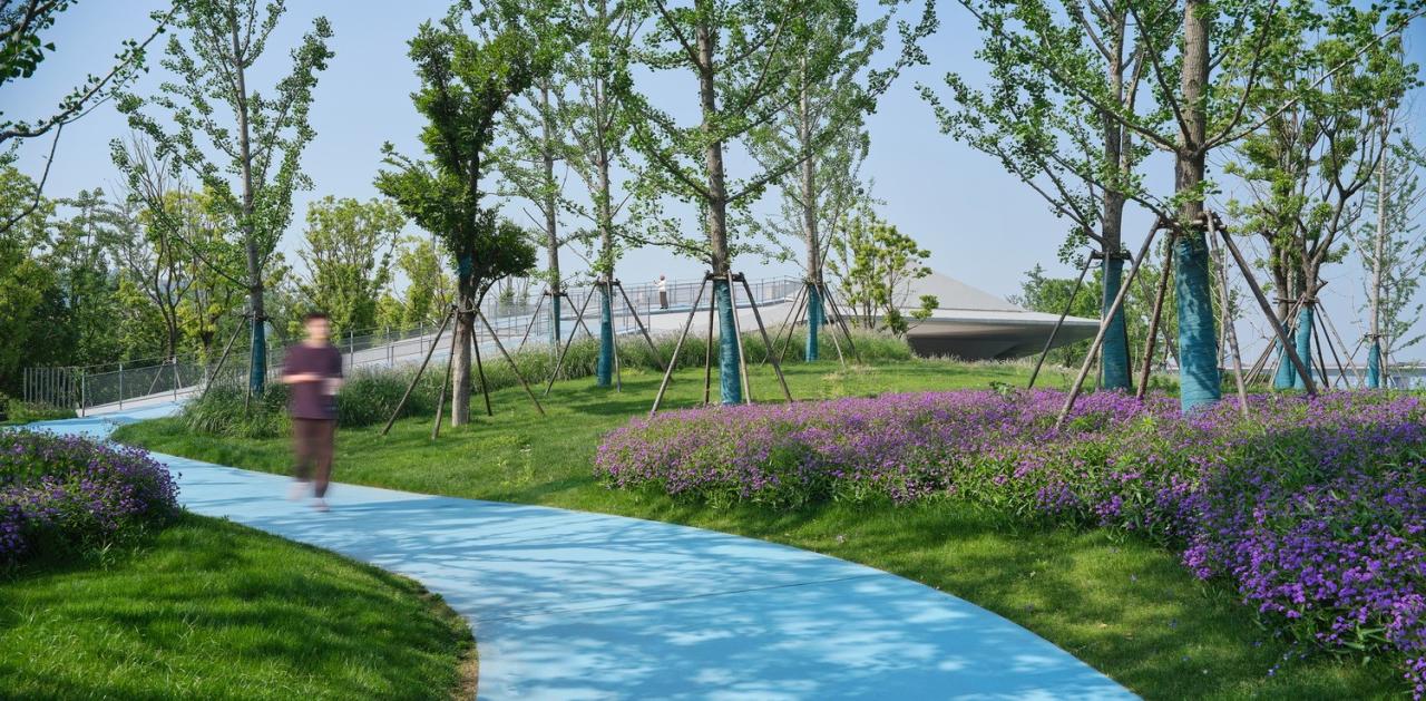 “城市切片”——沟通江景与城市的空间纽带为强化城市腹地空间与滨水公共空间的联系,在场地上布置多条“城市切片”,疏通绿植、路径联通。从浪潮形式演化出语言统一的树池、休憩亭、展墙、运动器械等景观小品,结合两侧的树种设计形成独具特色的垂江通道。作为杭州滨江公共空间的北段起始,三桥亚运公园包含滑板公园、湿地公园、云渡驿、亚运微丘等节点。在近期杭州市绿道建设推进协调小组的实地核查与综合比选中,“滨江区之江绿道滨江段”被评选为“2023年杭州市最美绿道”。