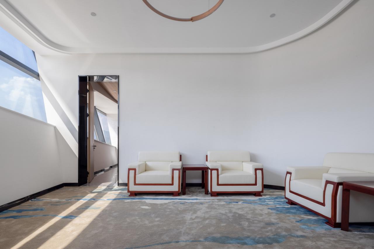 许多非标准的设施和空间也为建德千岛湖通用航站楼增添了许多航空发展的契机和独特体验。比如:室内外观摩空间。具有与塔台同等视野的倾斜屋顶被充分利用布置了阶梯状航展观演露台,方便未来航展、飞行表演和比赛观礼。另外还设有航空主题系列科教空间、低空旅游与航校培训空间。