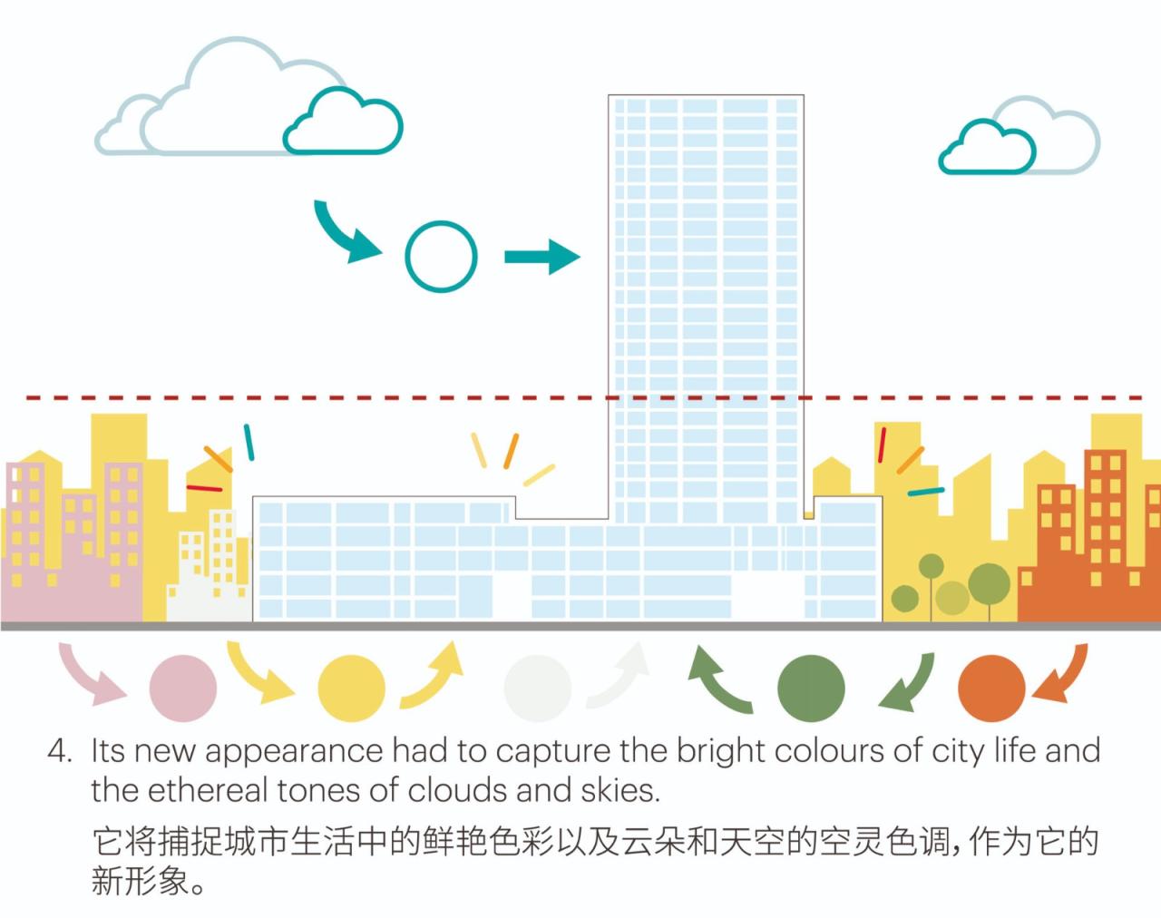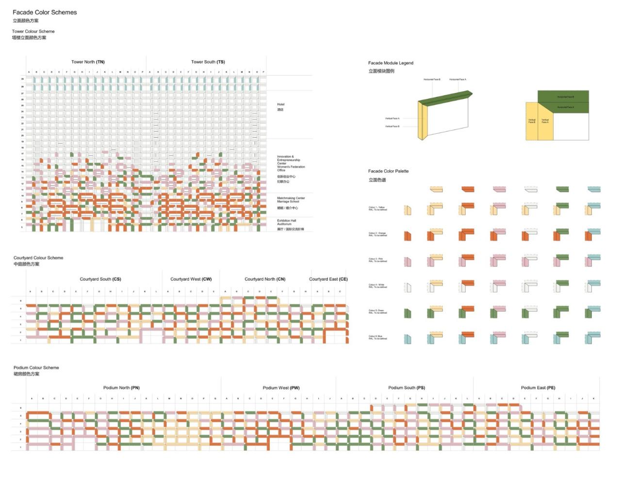 建筑立面系统采用的黄色、橙色、粉色和绿色也反映出建筑不同的功能空间。裙楼的丰富颜色传达出这栋大厦主要为妇女儿童服务的功能目的;塔楼的高层区域设置了酒店配套,采用了更加中性的白色立面。