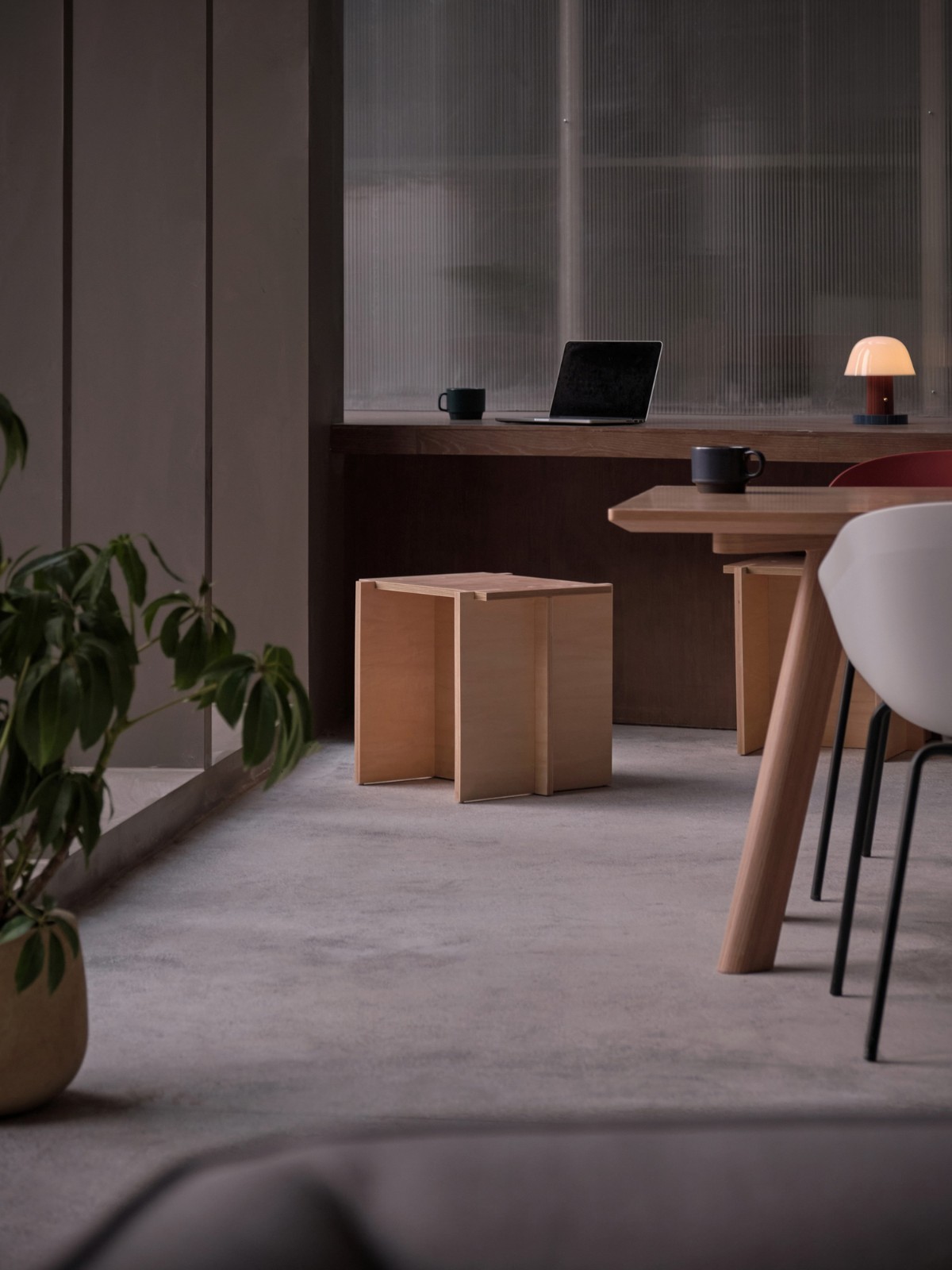 尽管如此,设计上还是尽可能的摒弃工业化、标准化的成品,多一些定制和现场制作的物件,同时,间筑还专为本项目设计了两款胶合板家具,并改良重产了原建筑内的一款工厂吊灯。而对于现场的施工错误,相对于严格的完全返工,更多的是通过调整局部,使其合理。