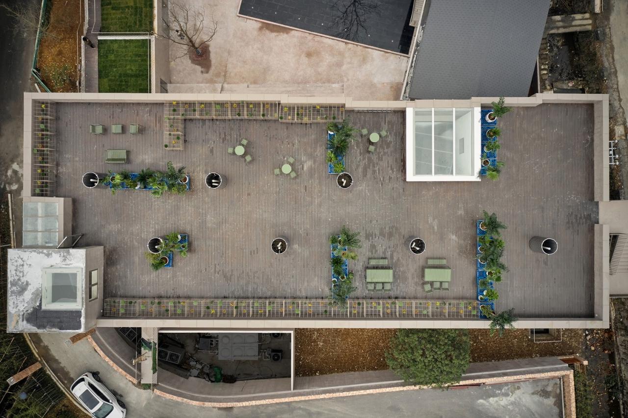 梯田原本厂房的功能是“加工”,但村子的属性更多为“种植”。设计首先保留了厂房之间的连通状态,把裙房原有的5个空间单元增至7个,整体形成了0.75米退级的“回”字型台阶式屋顶。层层退台的“梯田”形态是为了关照到建筑所在的坡地,同时也丰富了户外空间与动线。其次,设计在裙房屋顶上划分出约若干种植区和休息区,铺出两条1.2米宽的走道穿插其中,长期住客可在此种植蔬菜、香草等简单作物。而主楼屋面则用六十余个高1米的可移动植物架,围合出多组休闲空间。屋顶的不同层级为人们增添了多变的视野,高低错落的第五立面与周围环境相互映衬,建筑与地形、自然的关系变得更为密切。