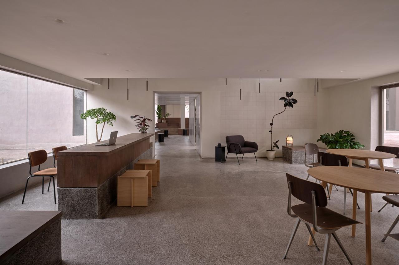 室内-行为引导空间在这个面积两千平米,却承载了多种功能的场所中,如果将进入建筑的人群按目的分类,可能会有:办公、就餐、参观、集会、烹饪、工作坊、长租、短住等若干种。通过空间划分和动线归置也许可以让几股人流尽量互不打扰,但却一定程度上破坏了这个随机社群的共有性,违背了“真实的空间”的设计初衷。我们将人群按照对私密性的要求等级进行了排列,除等级最高的主楼二、三层23间客房外,各公共空间都相应给予了一定的自由度。如主楼一层,既有刷卡进入的共享办公区,也有对外开放的展厅阅览区,但两个空间视线上却是联通的,仅以绿植做阻隔。而整个共享办公区,除两间会议室之外,皆为开敞的连续空间,只通过地面的抬高与下沉划分场地,且对每个区域的具体功能不做约束,使用者甚至可以自行改变格局。在这样自由的公共环境中,当然也需要一定的私密性,设计通过在几条动线中添加半围合区域,来实现一些“驿站”式的独处空间。值得一提的是,为了确保这样的自由空间不会为使用带来困扰,间筑也包揽了项目中所有的标识与导视设计。