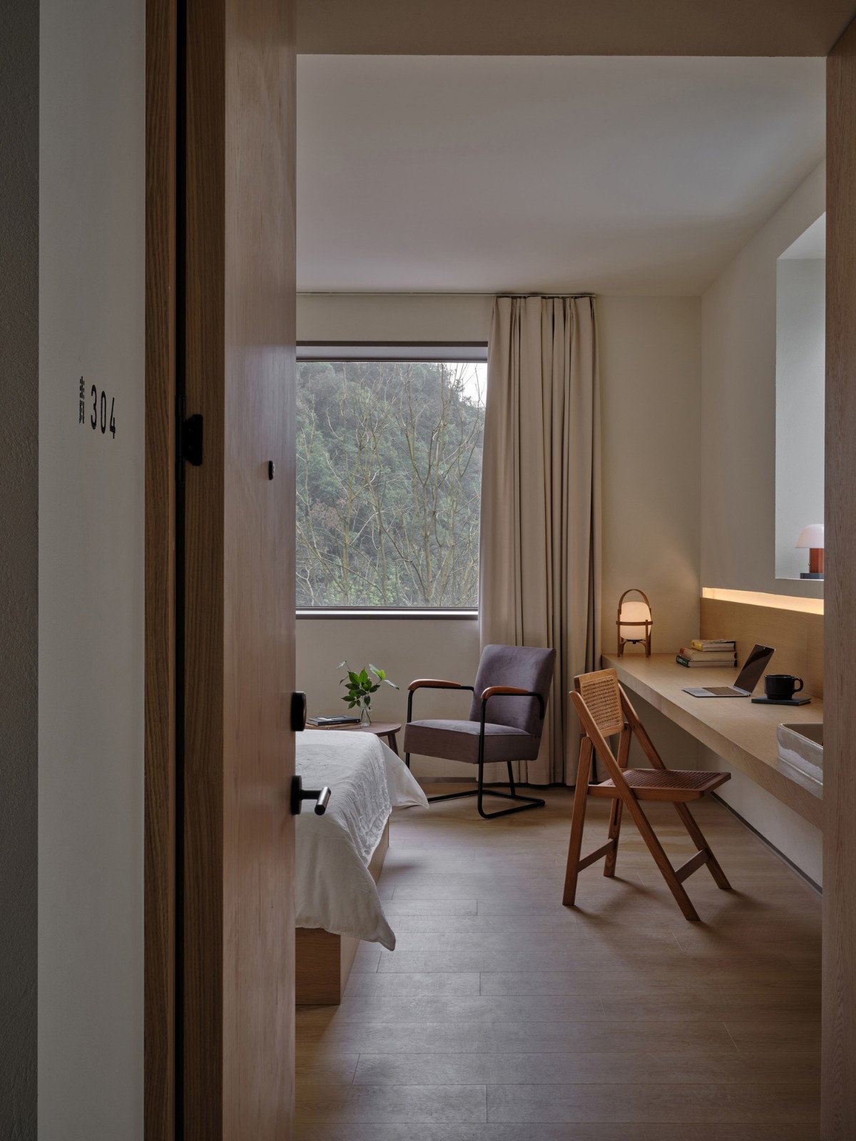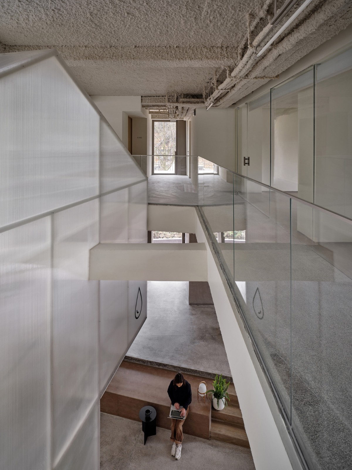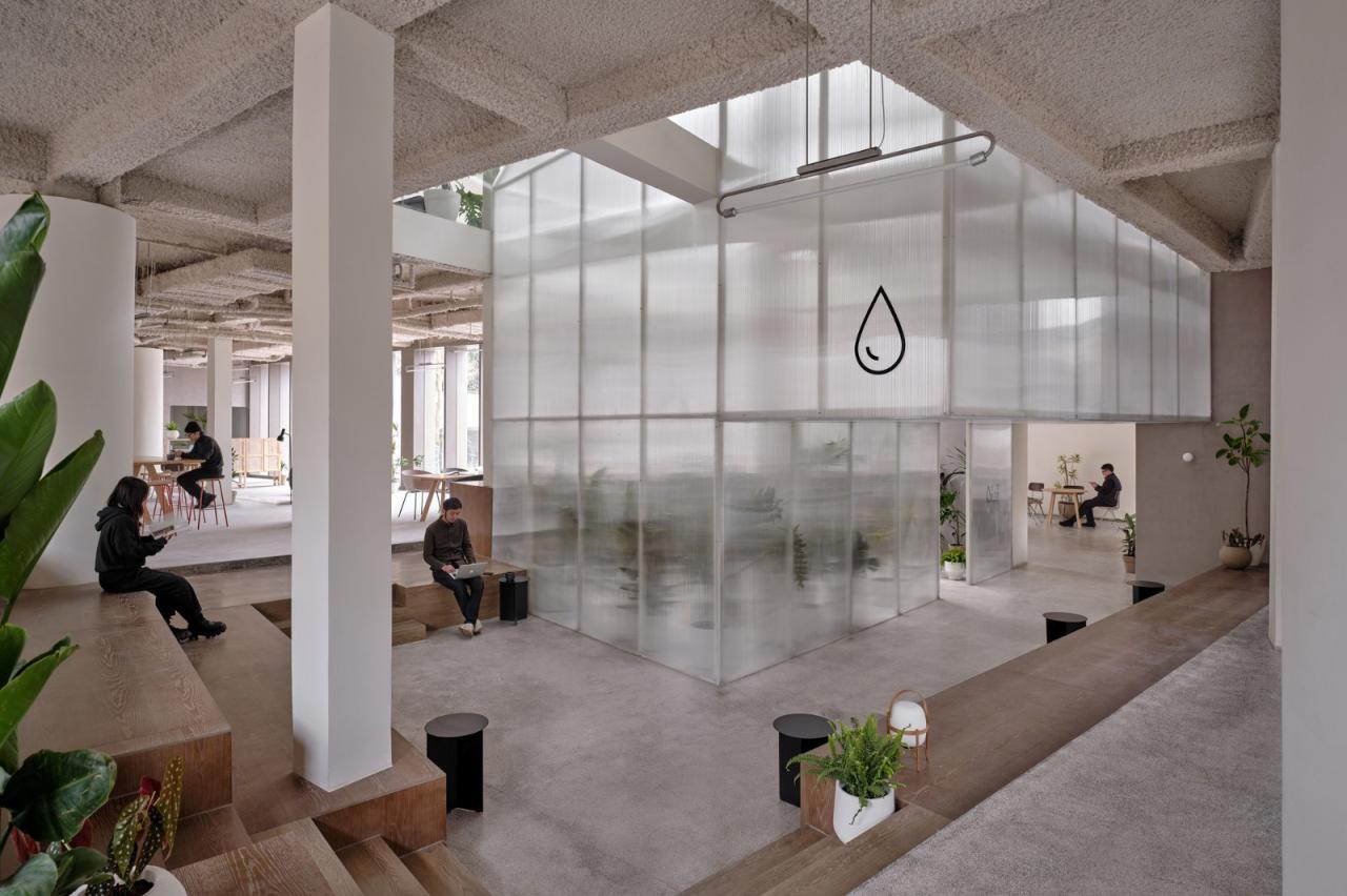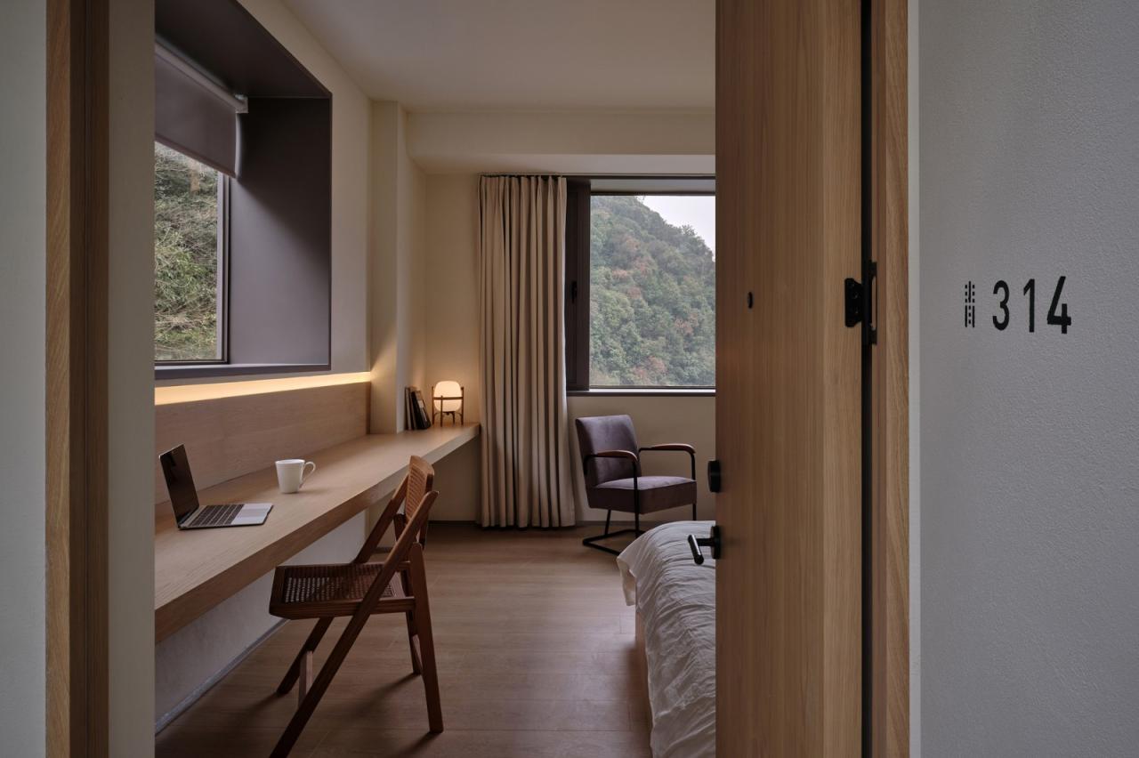 温室城市中的很多室内空间,会将光线和温度设定为恒定值,人在其中,很难感知到一天中自然因素的变化。而在青山村,即便拥有现代化的公共设施,村民的日常行为还是更依赖于自然光,例如即便村内道路照明齐全,日落之后也很少见到人们在户外走动。基于这些习惯,我们想要将更多的自然光线引入建筑中,增加空间中的“变量”。业主希望在主楼中放置一个以“水”为主题的展览空间,且其中的展品形式是多元的。受周边环境启发,我们以植物来表达水这个概念。设计将双坡屋顶房进行等比缩放后“生长”入主楼,筑出一间高约7米的温室,贯通三层,容纳植物并作为展厅。充足的自然光透过天窗照射至阳光板构筑的温室上,形成折射与散射,在一天当中呈现不同的色调与氛围,保证了植物耐活性的同时,也使温室作为整个项目的“内核”更为通透醒目。同时,设计将主楼西侧立面解构为11个单元,以温室为焦点形成向内层叠延伸的墙面构成,看似被“温室”的生长动势所挤压,也呼应了整体建筑的“梯田”形态。一层作为共享办公空间,东西两侧尽量多的以玻璃幕墙代替原有墙体,局部可开启对流、通风,营造室内外联通的空间氛围,同时让更多的光影变化在这个空间发生。二、三层则通过打开南侧的墙体与顶面,在客房走廊的尽头营造了两处贴近自然的休闲空间。