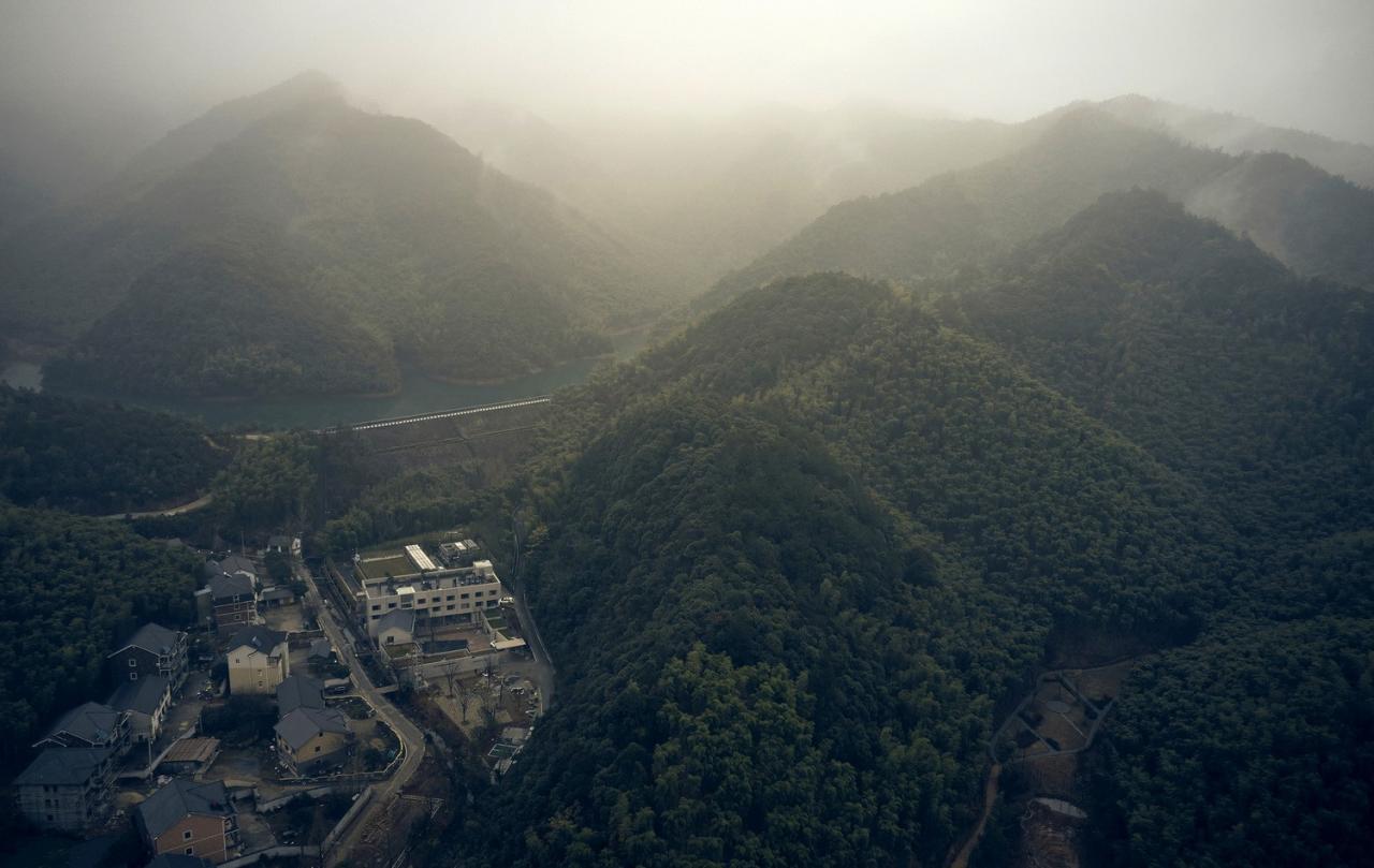 来到这里,停下来青山村所处的杭州余杭区,乡村经济实力雄厚,相对传统民居,富裕的当地村民更倾向于住在崭新的自建别墅中。鲜有的几幢老房子,也几乎皆被近年来此的新村民所修缮、使用。虽然村内已几乎看不到传统乡村建筑,但依水而聚的自然村落肌理却被很好的保留了下来。沿着水系逆流而上,几个自然聚落的农田、房屋交替经过,遂见竹林掩映、道路渐窄。行至山腹处是村内最为重要的水源地:龙坞水库,而水库前的最后几栋建筑便是青年社的项目基地。设计初始的几次到访中,建筑师发现由于后续通往水库的道路狭窄且坡陡,使得无论人们乘何种交通工具至此,到了基地前多数都会停车转为徒步继续前行。这种“停下来”的感受非常强烈,也给了后续的设计一些想法——如果将村子看做一栋住宅,青年社则像是其中的书房或卧室,白天惬意、夜晚静谧。