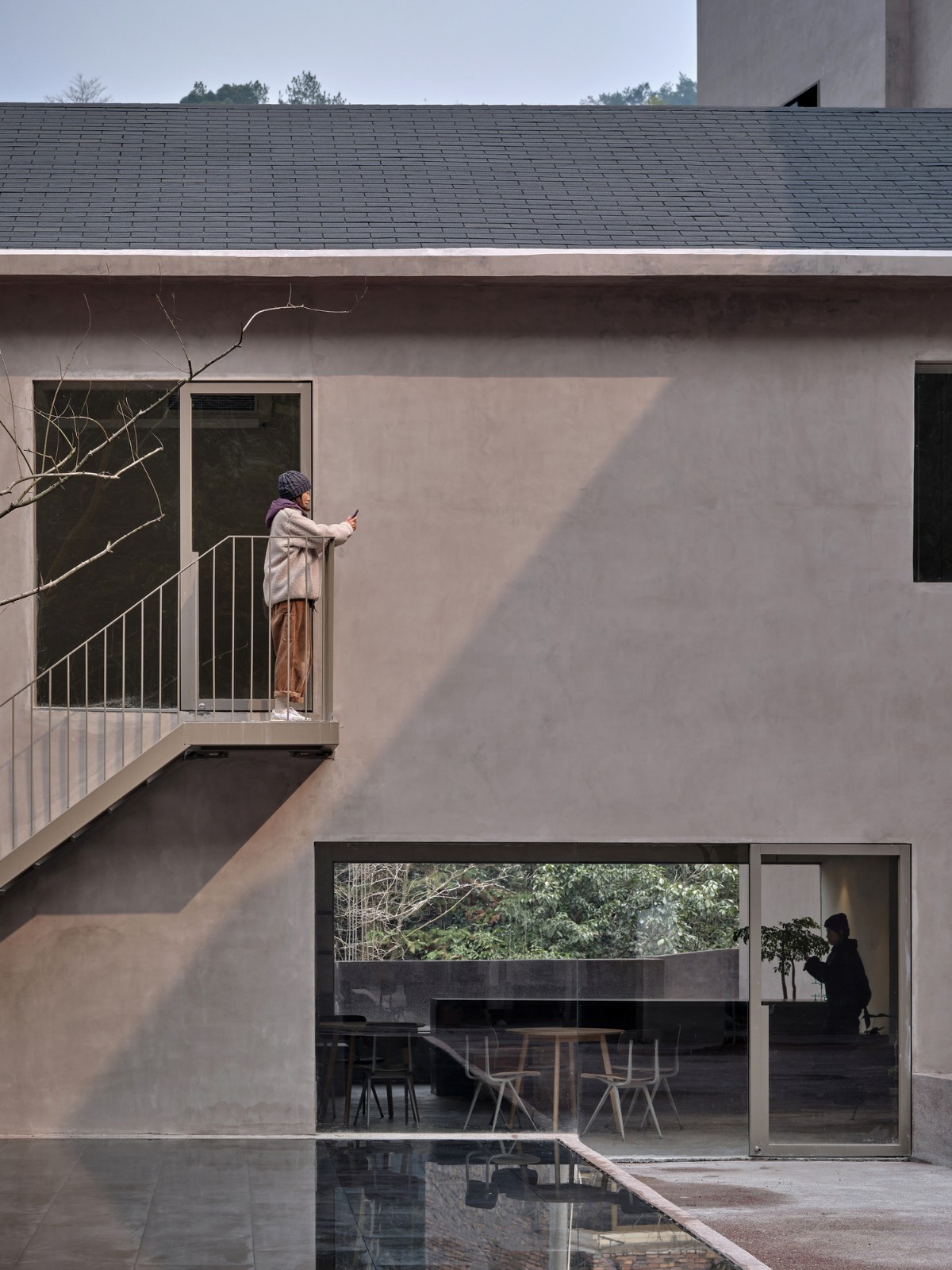 内院-树木聚人群青年社的内院是设计师将权力交还给使用者的部分,虽然建筑师在前期也进行了几种平面排布与推敲,但在这样的环境下总觉得有种“强加于人”的刻意,于是只保留了树木与水池。按照在村里生活了六七年的新村民的说法,在这里“有大树就可以聚拢人群,其他倒是次要的”。最终,建筑师选定了三棵枝条宽大,主杆分叉偏高的乌桕树。乌桕在5-7月开花,高大的树冠洒下一片荫凉,草木凋零繁茂之间,见得四季变化。另一方面,庭院水池是双坡屋顶房在户外的延伸,二者在空间上是垂直关系。水池高约30公分,水刷石覆底,水纹波动时,使方正的庭院有了空间上的灵动。那么很自然地,这里就是一个露天的舞台,是人与人交流,碰面的院子。