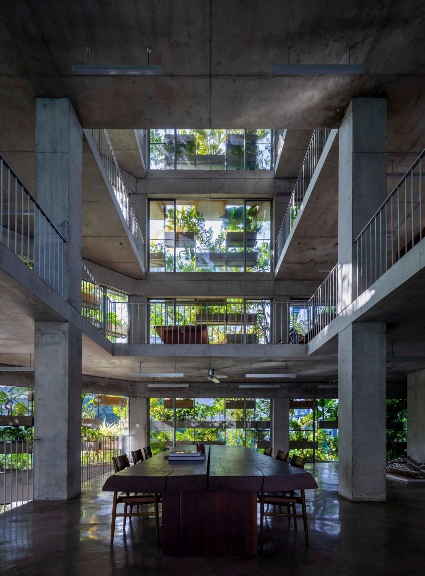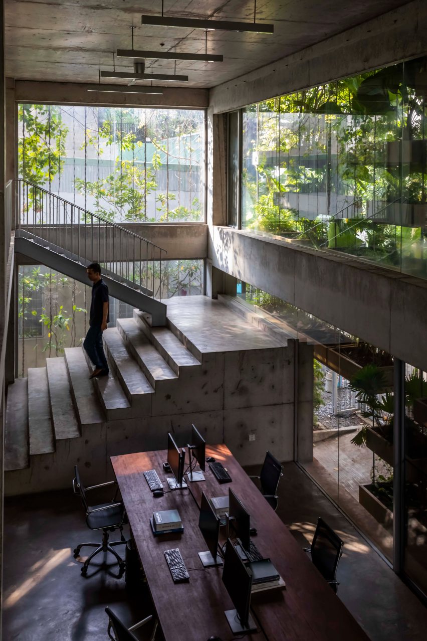 武重义工作室说:“(植被)用储存的雨水灌溉,而蒸发使空气冷却,”混凝土结构内部完全暴露,辅以深色木质家具和极简灯具,与种植的立面的明亮绿色形成对比。为了使办公区域尽可能开放,电梯和楼梯核心已被推到建筑的北角,在那里,带有通风小开口的砖墙已裸露,以允许未来的后部延伸。建筑师武重义于2006年创立了他的同名工作室,此后该工作室以探索低能耗建筑而闻名,通常将植物和竹子融入其设计中。该工作室最近完成的其他项目包括位于富国岛的一个度假胜地的竹子欢迎中心,以及位于河内钵场镇(Bat Trang)的一座由穿孔砖墙和一系列高架花园空间包裹的住宅。