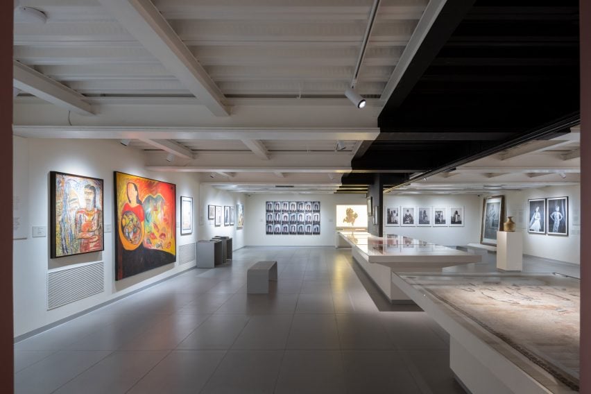 这座占地4000平方米的博物馆的上层覆盖着不锈钢面板,这些面板上浮雕着水箱上常见的十字图案。根据该工作室的说法,这种饰面的设计是为了表达艺术就像水一样珍贵的理念。与尼莎-马修(Nisha Mathew)一起领导工作室的戈什(Ghosh)说“这是对艺术能力的隐喻性引用,它可以为反思、改变和进化创造社会和文化的推动力,”