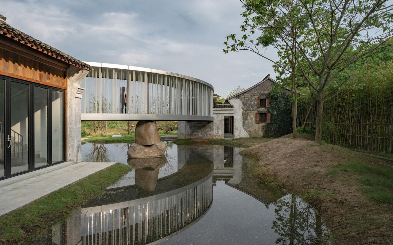我们以一个简约的廊桥联系两个院落:从大院落中屋顶部分坍塌的小体量出发,与小院落的山墙擦肩而过。廊桥对老建筑的全部影响,也仅仅限于山墙上新增的门洞。在廊桥中行走,随着弧线的角度变幻而步移景异,山水长卷般的风景徐徐展开。廊桥同时也成为了茶歇空间。廊桥面向山丘的一侧为三种细柱排成的不规则阵列,镜面、磨砂、透明三种表面形成极为丰富的反射和折射,让滤过的阳光形成迷人的光影效果。细柱间的空隙防止跌落,同时以极佳的自然通风,避免廊内产生高温。