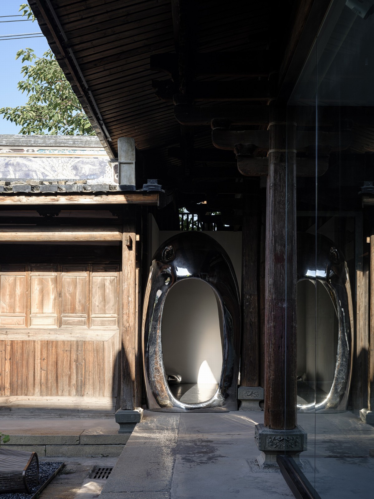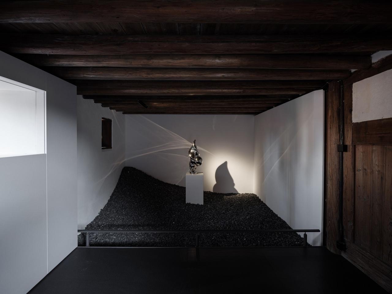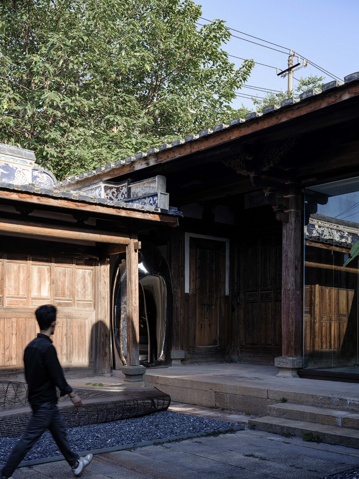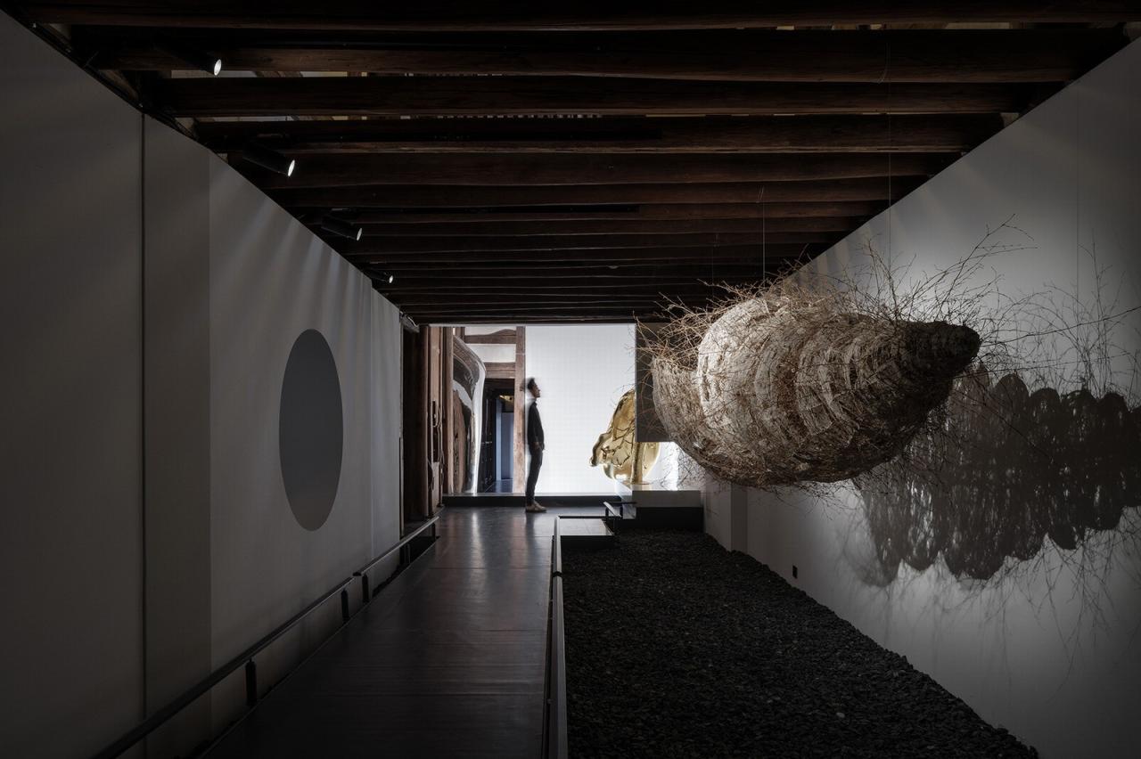 建筑师提取了中国园林连廊的元素,并将屋中造园的手法应用于空间设计中。通过用平桥的概念,将原本不连贯、参差不平的房间及高矮不同的门槛串联起来,创造出一个类似现代“T台”的观展线路。参观者可以在展厅内移步异景,体验空间变化的同时欣赏艺术品,也能够感受到古建筑的斑驳感。
