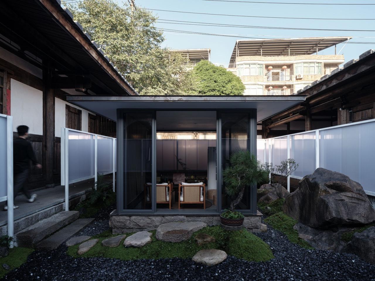 后院天井院中造园、钢板与玻璃成型的茶亭、耐力板围合的现代“围墙”,置入蓝白可变的光色,若隐若现,充分保证了接待的隐私性。同时,错落有致的生态造景,四时交替,于喧嚣的城市中独享一隅静谧。
