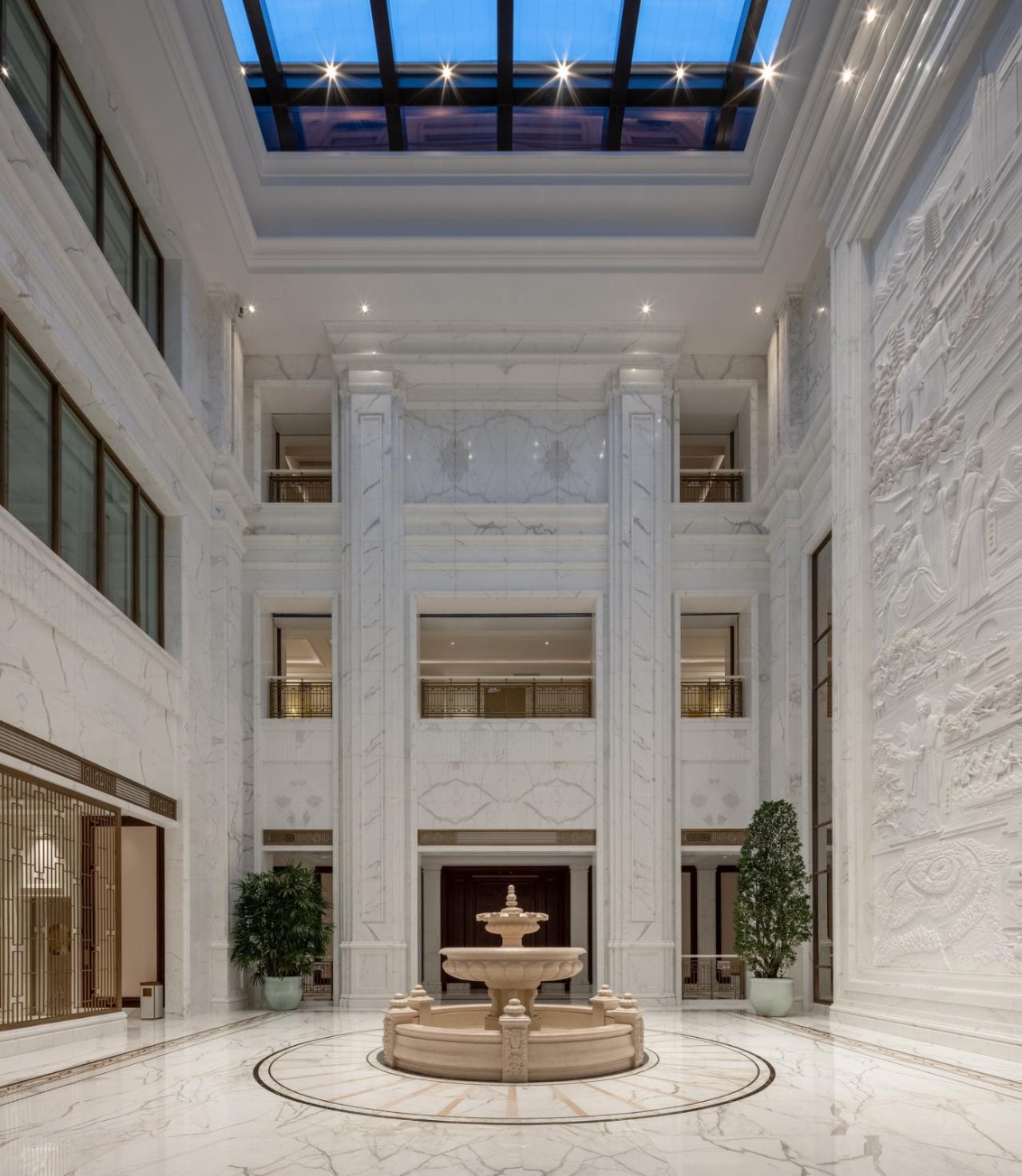 建筑材料和细节的控制在细腻和庄重之间寻求平衡,浅色偏暖的石材体现了酒店在接待重要宾客时所需的沉稳气质,同时传达了江南的精致底蕴。铝板檐口、石材叠层窗框和花格窗等细节元素既传统又创新, 展现出江南的特色。