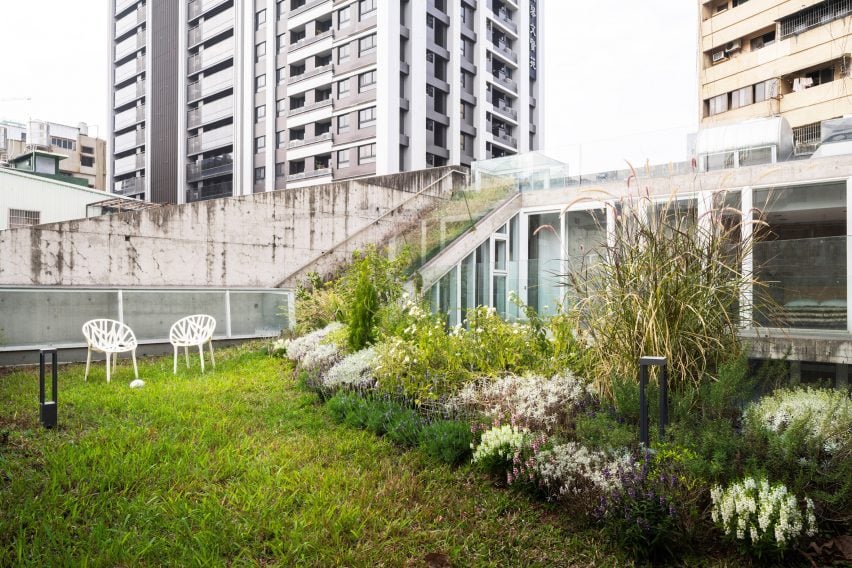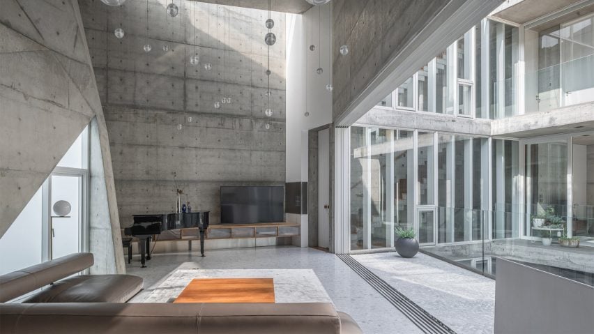 这个工作室说:“中央庭院和一系列缓冲在公共和私人区域之间的外部露台解决了明显的矛盾。”它补充道:“由于墙板结构系统消除了所有柱子,每个房间都可以畅通无阻地看到庭院,那里有一个倒影池和一个禅宗花园。”