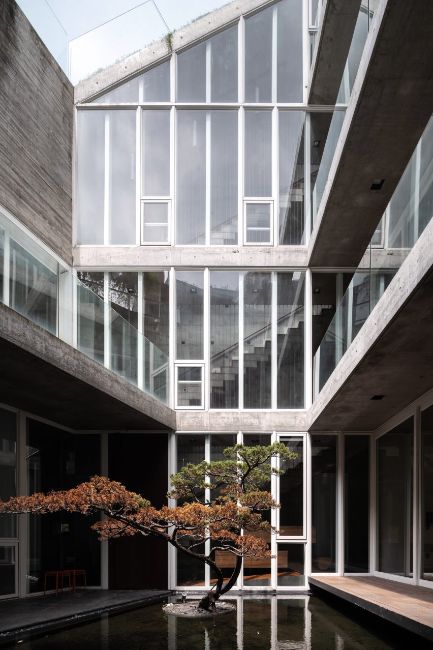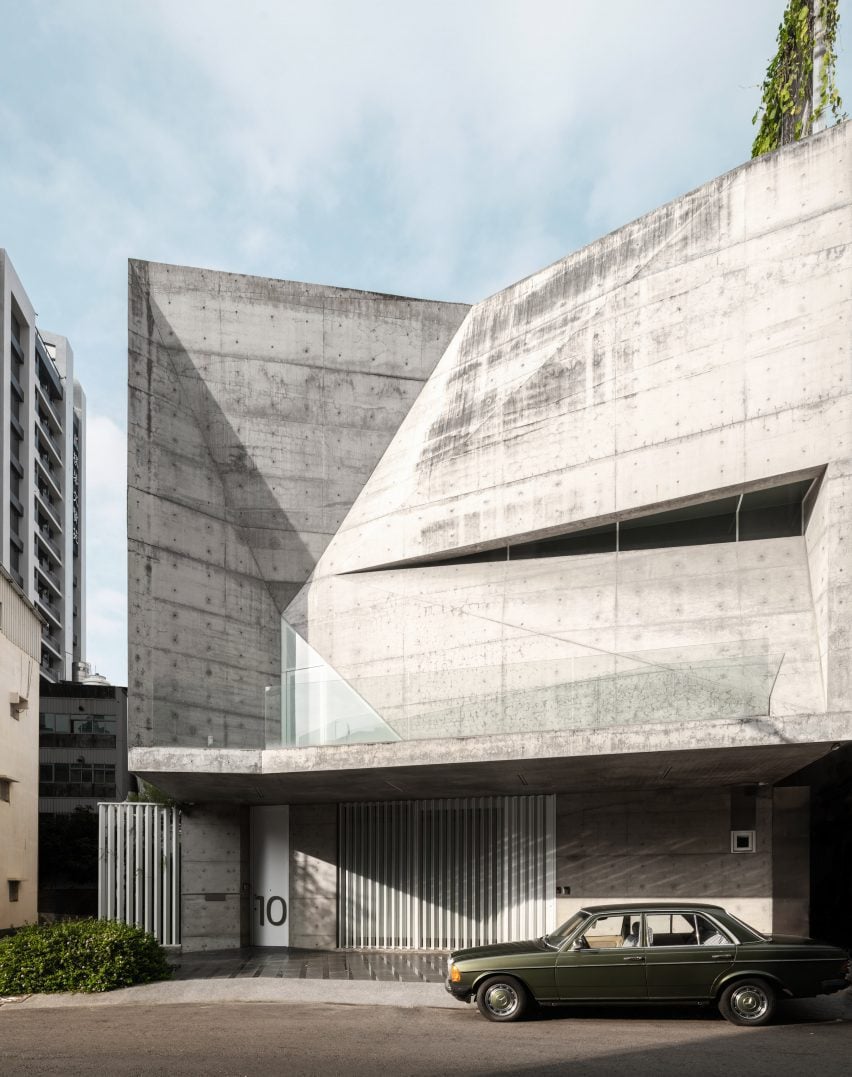 这座位于台湾高雄的四合院由当地格拉提安工作室(Atelier Gratia)设计,由折纸式的棱角分明的裸露混凝土墙包裹着它,成为远离周围城市街区的“掩避所”。
