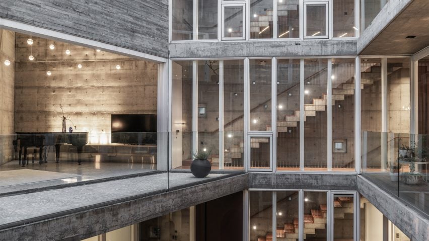 房子东部边缘的楼梯连接着每一层。室内可以通过全高窗户看到,全高窗户旨在为所有空间提供光线和视野。该工作室表示:“与封闭的外立面形成对比的是,内立面完全向内部庭院开放,并配有落地窗。”