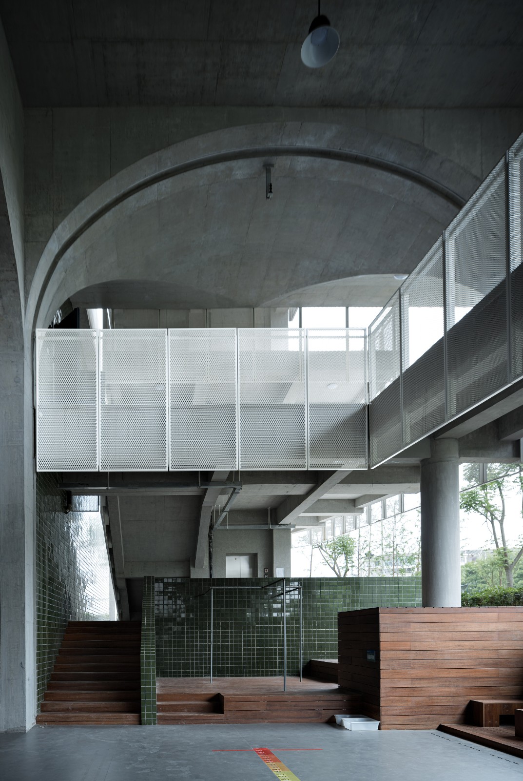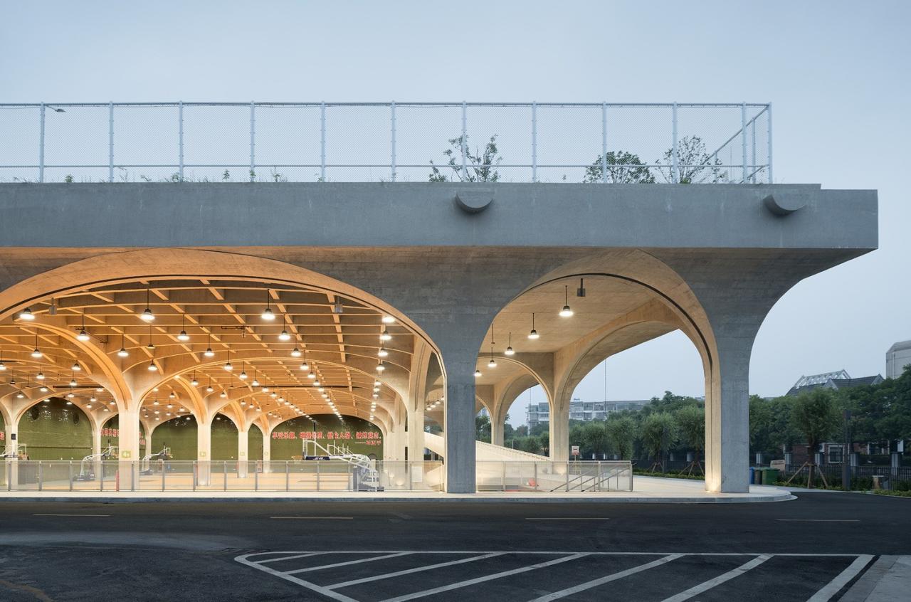 象的构筑为解决用地缺乏的问题,我们“被迫”将足球场及其他运动场地上下叠合。大型的足球场下自然形成了一片超大尺度的有顶空间。结合运动场的开放属性,我们以“架空层”的形式呈现下方功能。就像城市建筑投下的阴影所形成的开放公共空间一样。这些公共空间,并不需要华丽的修饰和高昂的成本,它们是质朴且粗放的。每每烈日当空或阵雨倾盆,人们总是迅速地钻进这些遮蔽的开放区域里。我们将这些永恒的场景复制于风雨操场下,希望能使它经受起了季节的更替、城市的变迁、时间的冲刷,并不断地自我变革。当架空层成为了项目的核心,架空层中运动场地就不是简单的地面又或是建筑内部,它是全天候的外部共享空间。