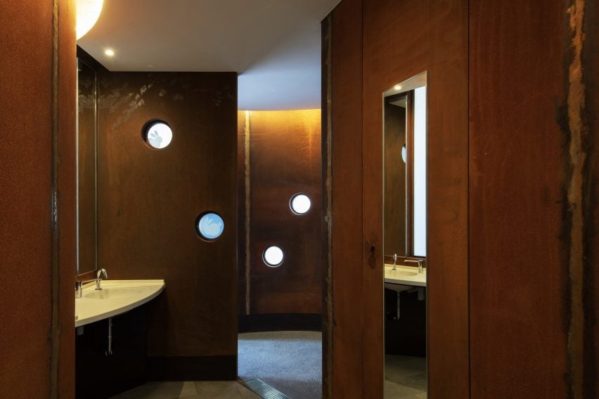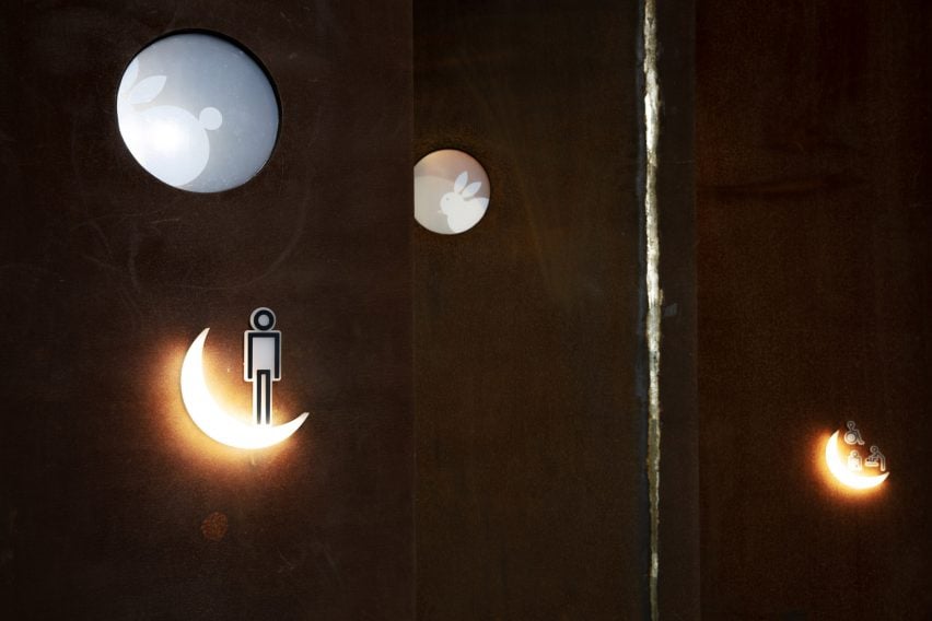 在主建筑旁边,一对圆柱体包含儿童厕所,而附近有一个喷泉。选择用耐候钢建造结构,因为它的耐用性、强度和质地。为了给这个项目增添奇思妙想,在耐候钢上开了一系列圆孔,里面有兔子的图案。