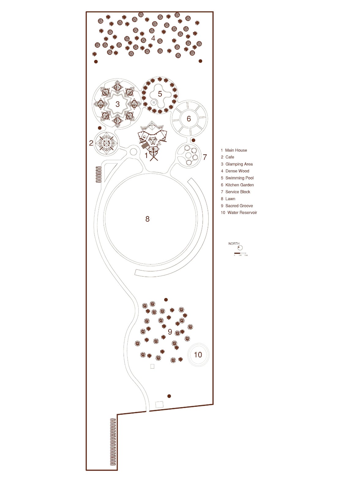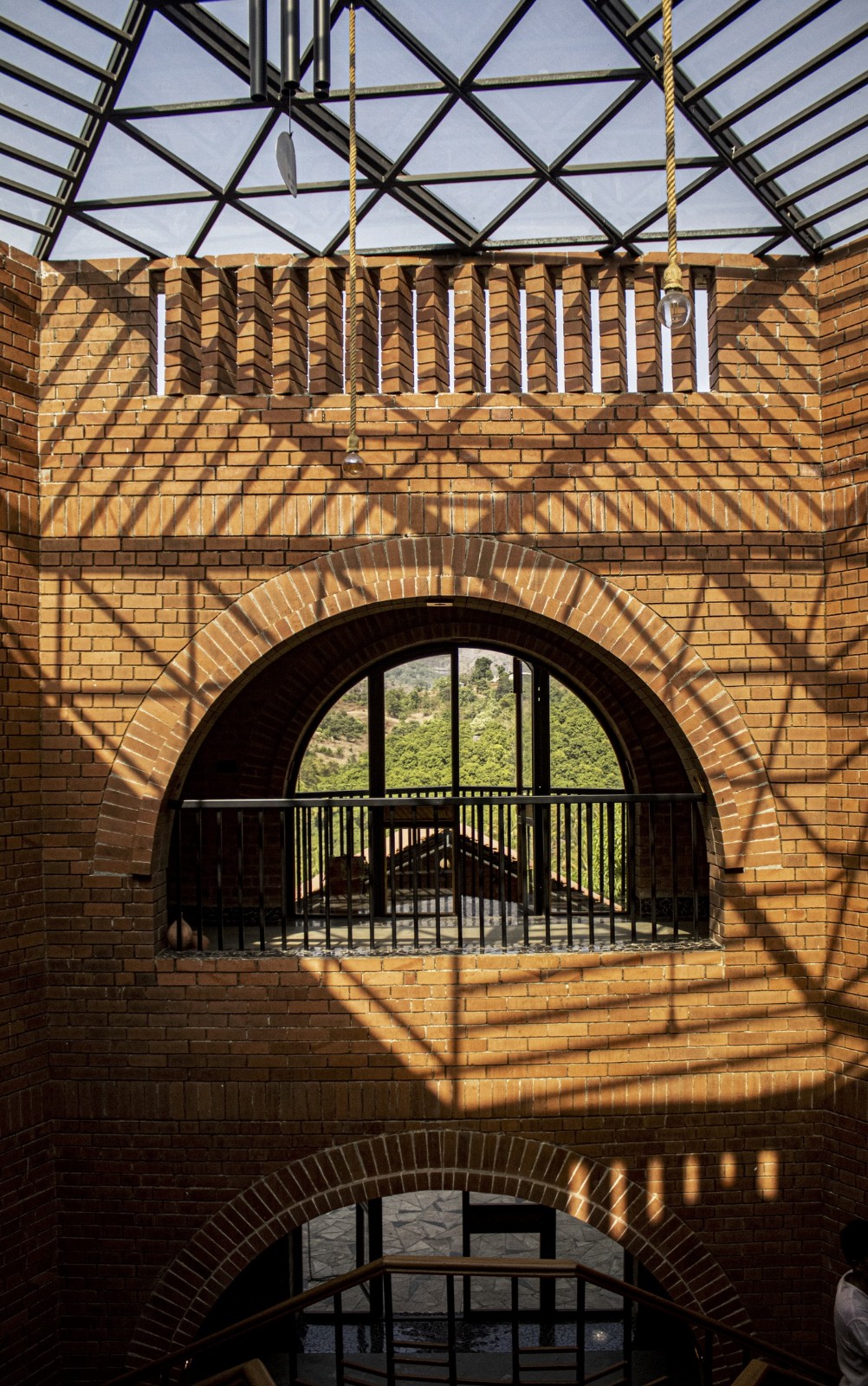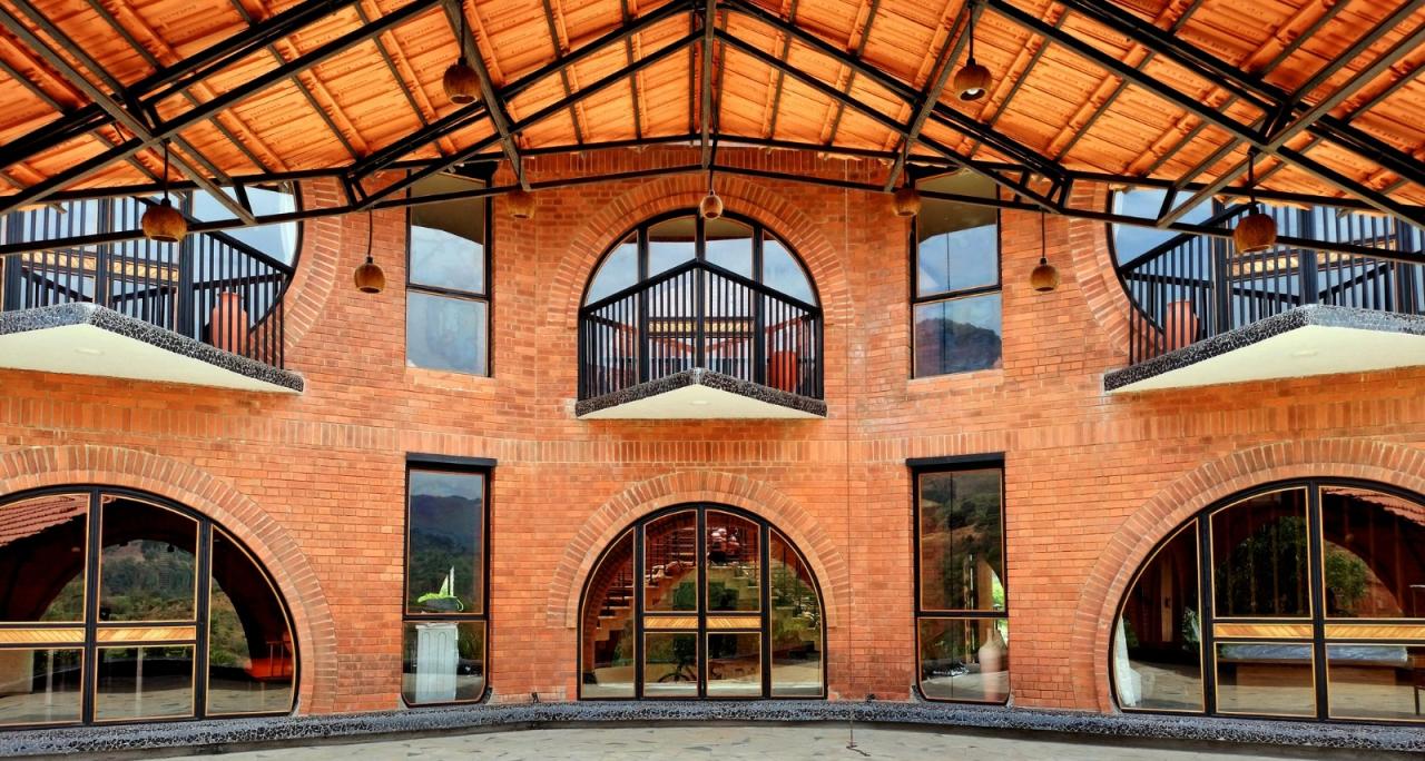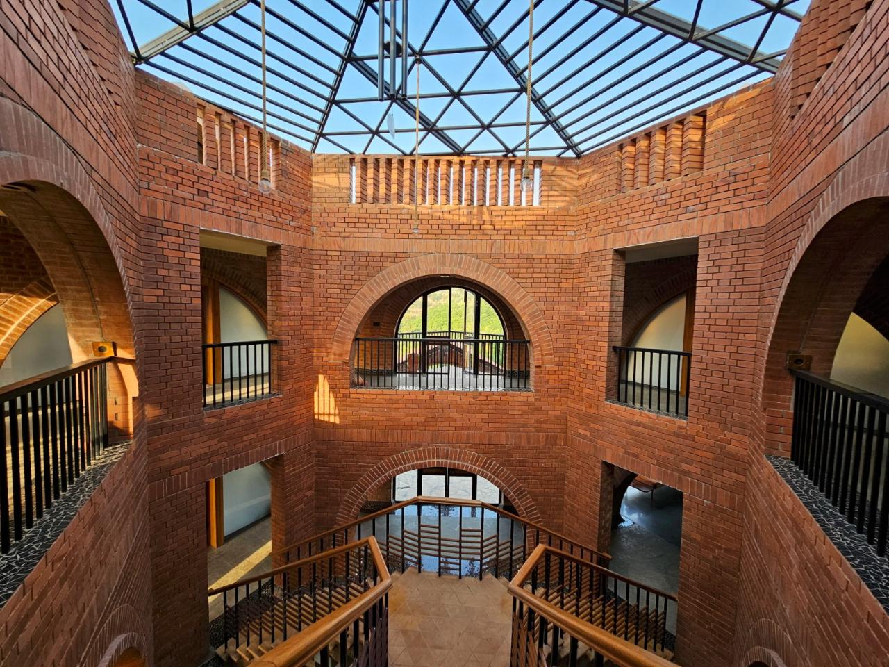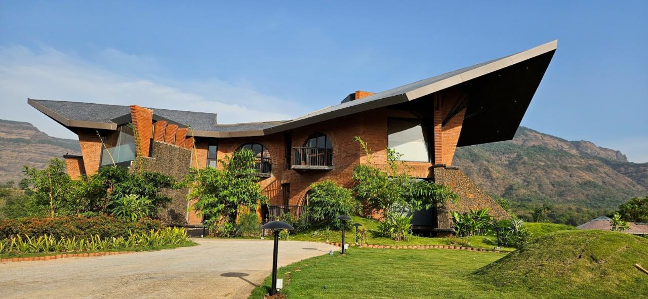 该住宅是阿尔雷贾先生及其家人的乡间别墅,他们主要居住在孟买。该住宅占地 20 英亩,位于马瑟兰山脚下,从车道顶端到水边的落差达 110 英尺。这座乡村农舍包括一个容纳了六人床的房子,周围环绕着共享的复古空间、露营区、游泳池、服务区、员工宿舍、蓄水池、一大片草地、神圣的溪谷,以及一直延伸到河边的荒野树林。房子的中心是一个采光充足的三角形中庭,整个房子都围绕着中庭旋转;其他空间则从三个方向向外延伸,朝向大自然,形成了一个神圣的三螺旋几何图形,最大限度地将周围的山景尽收眼底。因此,这座房子展示了内向的中心和外向的空间,向外延伸并融入自然。