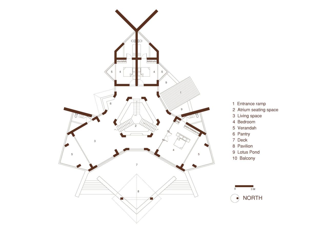 几何学人类存在于一种有节奏的模式中,他的艺术形式也是如此,开始到结束,结束到再次开始。这些模式存在于其中,因为它们以特定的思想为中心,并受该思想的影响。如果思想发生变化,图案也会随之变化。房屋几何在营造和谐与宁静方面发挥着重要作用。“山尘之宅”的房屋几何以方形和三角形网格为基础–形成了一个三曲腿图几何系统,与景观的圆形几何相平衡。