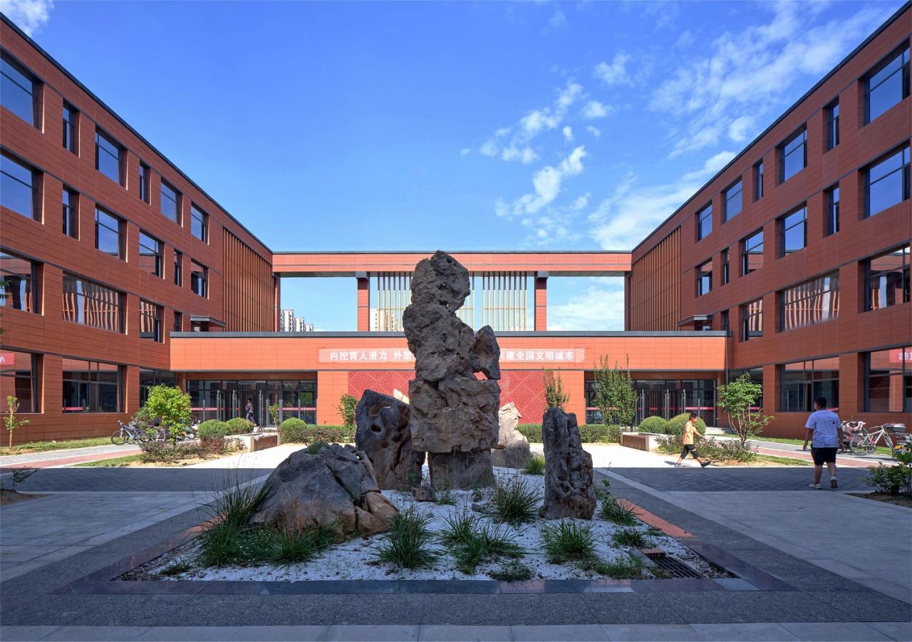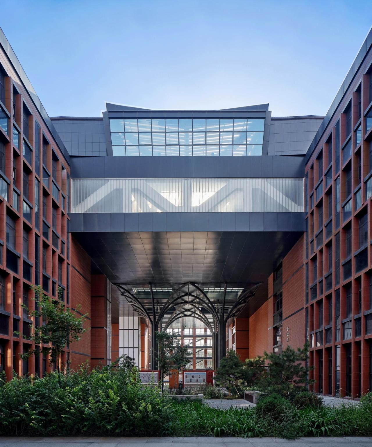 教学区的各组团形成六个文化院落,将传统的“六艺”与现代教学内容相结合,每个院落都独具自身的文化魅力;综合楼现代材料筑成的屋顶,近看有传统建筑的印象,远观则构成迭起的山峦,营造出具有山水意向的校园建筑。
